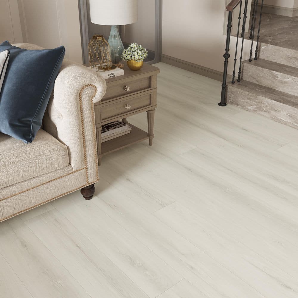 Introducing Coral Cove Hickory Luxury Vinyl Planks, a refined flooring solution seamlessly uniting style and durability. Measuring 7 in. x 48 in., these exceptional vinyl planks showcase sophisticated light grey hues adorned with natural knots and grains, creating an authentic wood aesthetic that injects timeless elegance into any space. Tailored for both residential and commercial settings, these planks not only captivate with their visual appeal but also provide practical benefits. Engineered to be 100% waterproof, they effortlessly withstand spills and moisture, making them well-suited for high-traffic zones such as kitchens, bathrooms, and basements. The scratch and stain-resistant surface ensures an enduring pristine appearance, while the pre-attached backing amplifies sound reduction and underfoot comfort. With a user-friendly drop-lock system, installation becomes a breeze, establishing Coral Cove Hickory LVT flooring as a versatile and resilient choice for elevating living rooms, kitchens, bathrooms, and commercial spaces with an impeccable blend of style and functionality.. Antimicrobial: Non-antimicrobial. Application Location: Floor. Cases Per Pallet: 32. Color Family: Gray. Color/Finish: Coral Cove Hickory. Commercial / Residential: Commercial / Residential. Edge Type: Micro Beveled. Features: Mark Resistant,Phthalate Free,Removable,Scratch Resistant,Skid Resistant,Stain Resistant. Flooring Product Type: Vinyl Plank. Flooring and Tile Look: Wood Look. Gloss: Low Gloss. Indoor/Outdoor: Indoor. Installation Method: Click Lock. Installs Over Subfloor: Concrete,Plywood,Tile,Vinyl. Location: Bathroom,Entry Way,Kitchen. Material: Vinyl. Minimum Acclimation Period: No Acclimation Required. Pattern Look: Straight Plank. Pieces Per Case: 10. Plank Length: Long. Plank Width: Wide plank (7+ in). Product Weight (lb.): 42.11 lb. Returnable: 90-Day. Species Look: Hickory Look. Underlayment Options: Underlayment Required - Pre-Attached. Water Protection: Waterproof. Approximate Plank Size (in.): 48 x 7. Product Length (in.): 48.03 in. Product Thickness (mm): 5 mm. Product Width (in.): 7.13 in. Wear Layer Thickness (mil): 12 MIL. Wear Layer Thickness (mil): 12 MIL. Water Protection: Waterproof. Flooring and Tile Look: Wood Look. Plank Width: Wide plank (7+ in). Features: Scratch Resistant. Features: Stain Resistant. Features: Mark Resistant. Features: Skid Resistant