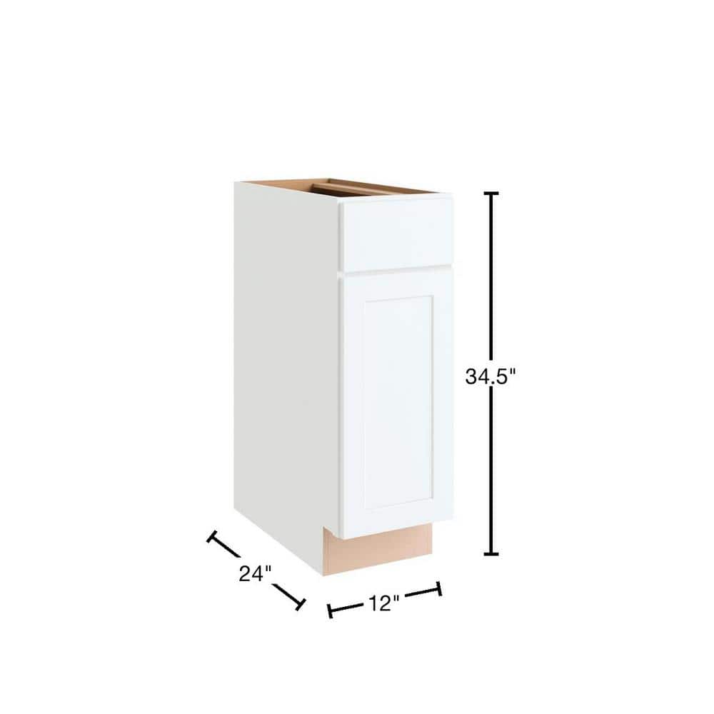 Our Hampton Bay Shaker Assembled 12-in. Base Cabinet in Polar White provides a base cabinet option to fit your unique space. Courtland Shaker in Sterling Gray provides you with the latest on-trend style and color choices. The cabinet is preassembled for hassle-free installation. Box Material: Furniture Board. Cabinet Construction: Framed. Cabinet Door Height (in.): 11.65. Cabinet Door Width (in.): 11.625. Cabinet Finish: Laminate. Cabinet Material: Furniture Board. Cabinet Shade: Light. Cabinet Type: Base. Color Family: White. Color/Finish: Polar White. Door Handing: Reversible. Door Material: MDF. Finished End: Right and Left. HUD Approved: No. Kitchen Cabinet Features: No Additional Features. Number of Drawers: 1 Drawer. Number of Shelves: 1 Adjustable Shelf. Overlay Type: Full. Assembled Depth (in.): 24 in. Assembled Height (in.): 34.5 in. Assembled Width (in.): 12 in. Interior Cabinet Depth (in.): 23.5 in. Shelf Thickness (in.): 0.75 in. Assembled Width (in.): 12 in. Door Material: MDF. Cabinet Type: Base. Assembled Depth (in.): 24 in. Assembled Height (in.): 34.5 in. Cabinet Shade: Light. Box Material: Furniture Board. Cabinet Material: Furniture Board.