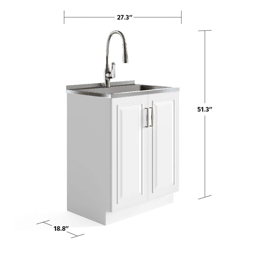 If you're looking to create a contemporary style in your laundry room. The Hennessy Laundry Cabinet will meet all your needs. It features shaker style doors, welded stainless steel sink, high arc faucet and Brushed Nickel door pulls bringing beautiful design to a functional space.. Color Family: White. Color/Finish: Pure White. Faucet Finish: Chrome. Faucet Flow Rate (gallons per minute): 14. Faucet Handle Type: Lever. Features: No Additional Features. Included: Cabinet,Faucet. Material: MDF. Number of Basins: 1 Basin. Product Weight (lb.): 67.9 lb. Returnable: 90-Day. Sink Gauge: 20 Gauge. Sink Mount Type: Undermount. Sink Type: Laundry Sink with Cabinet. Sink capacity (gallons): 14. Basin Front to Back Width (in.): 18.90 in. Basin Left to Right Length (in.): 27.56 in. Basin Top to Bottom Depth (in.): 9.92 in. Center-to-center measurement(in.): 1. Product Depth (in.): 18.9 in. Product Height (in.): 34.32 in. Product Width (in.): 27.6 in. Sink Drain Opening (In.): 3.5. Sink Front to Back Width (in.): 12.46 in. Sink Left to Right Length (in.): 24.57 in. Sink Mount Type: Undermount. Sink Type: Laundry Sink with Cabinet. Number of Basins: 1 Basin. Sink Left to Right Length (in.): 24.57 in