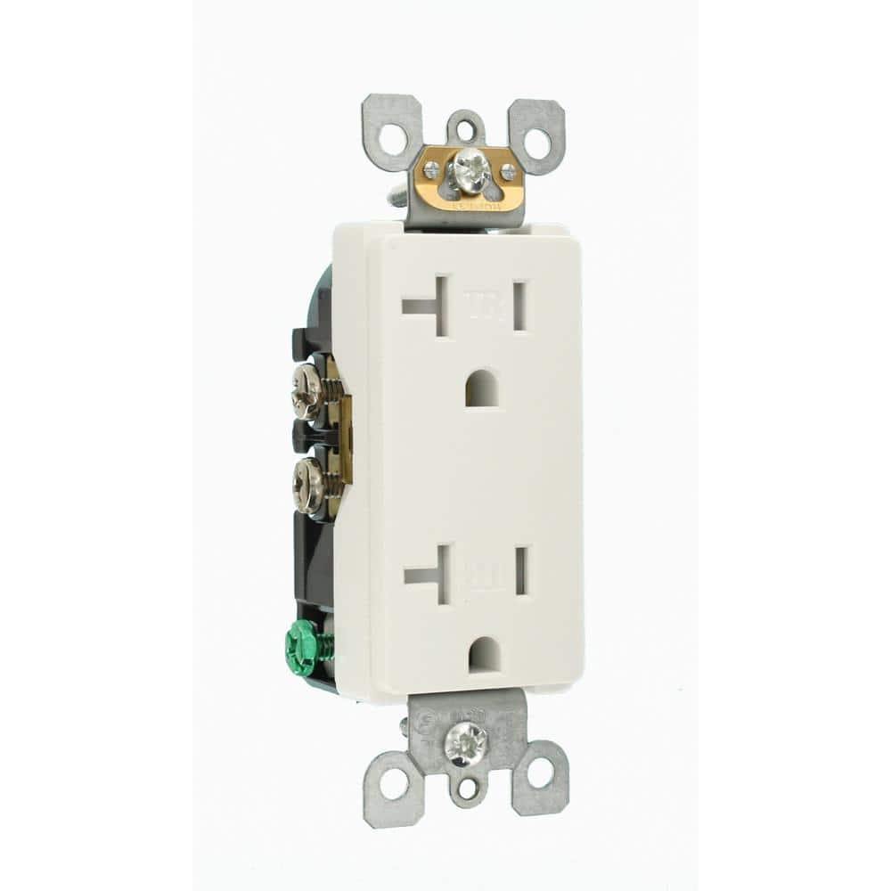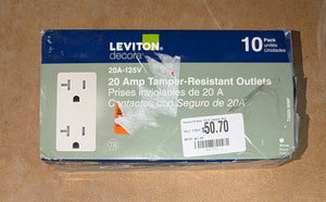 Leviton's Decora duplex receptacles are designed for a chic appearance, quick installation and durability. The impact-resistant thermoplastic design allows for a long service life and high performance in homes, offices, schools and other settings. It also coordinates beautifully with Leviton's complete line of Decora devices.. Amperage (A): 20 A. Color Family: White. Color/Finish: White. Commercial/Residential: Commercial,Residential. Configuration: Standard. Device Style Type: Outlet w/o Wall Plate. Durability: Tamper Resistant. Electrical Features: No Additional Features. Grounding: Ungrounded. Included: Mounting Hardware. Indoor/Outdoor: Indoor. Maximum Amperage (A): 20 A. Mounting Type: In-Wall. NEMA Configuration: NEMA 5. Number of Outlets: 2. Number of Poles: 2. Outlet Configuration: Duplex. Outlet Location: Wall. Outlet Material: Thermoplastic. Outlet Type: Not Protected. Package Quantity: 10. Plug Configuration: 5-20. Rating: Tamper Resistant. Receptacle Configuration: 5-15. UL Listing: 1-UL Listed. Voltage: 125 volt. Voltage (V): 125 V. Wall Plate Configuration: Duplex Outlet. Wire Connection Location: Back,Side. Wire Connection Type: Screw Terminal. Certifications and Listings: CSA Listed,UL Listed. Outlet Depth (in.): 11. Outlet Height (in.): 4.2. Outlet Width (in.): 12. Package Quantity: 10. Number of Outlets: 2. Configuration: Standard. Durability: Tamper Resistant. Grounding: Ungrounded. Indoor/Outdoor: Indoor
