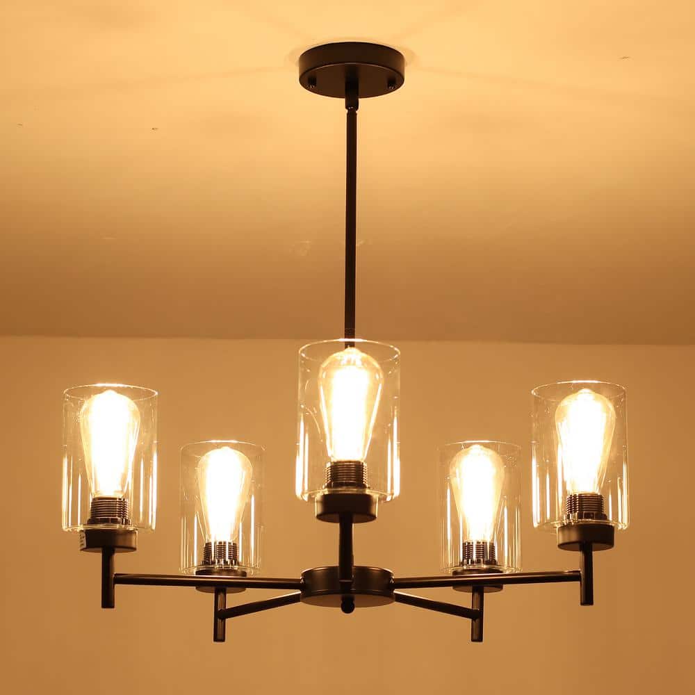 Crafted from metal, comes with high clear glass shades, The matte black brushed finish creates a cozy and comfortable home atmosphere and injects an airy modern twist on farmhouse design while lasting elegance. Beyond brightening your abode, these dining room light fixtures make a statement in any interior design without occupying valuable floor space. This simple and elegant design chandelier made with clear glass shade widely used in indoor lighting and different style of farmhouse, kitchen, dining room, foyer, entryway, living room, loft. Also, this pendant light equipped with angle-adjustable ceiling canopy which could be mounted on vaulted or angled ceilings.. Chandelier/Pendant Design: Island,Shaded. Compatible Bulb Type: CFL,Halogen,Incandescent,LED. Damp/Wet Rating: Dry Rated. Decorative Accents: No Decorative Accents. Dimmable Capability: Dimmable. Features: Adjustable Hanging Length,Dimmable,Sloped Ceiling Adaptable. Fixture Color Family: Black. Fixture Color/Finish: Black. Fixture Material: Metal. Fixture Shape: Linear. Glass Shade Type: Clear glass. Hanging Device: Down Rod. Included: Downrod Included,Hardware Included,Mounting Hardware Included,Sloped Ceiling Adaptor. Light Bulb Base Code: E26. Light Bulb Type Included: No Bulbs Included. Light Direction: Up/Down. Location Use: Bedroom,Dining Room,Foyer,Kitchen Island,Living Room. Max. Bulb Wattage (W): 60 W. Minimum Hanging Length (in.): 13.8 in. Number of Lights: 5. Number of Tiers: No Tier. Power Source: Hardwired. Product Weight (lb.): 7.08 lb. Recommended Light Bulb Shape: A-Shape. Recommended Light Bulb Shape Code: ST64. Returnable: 90-Day. Shade Color Family: Clear. Shade Material: Glass. Shape: Cylinder. Volt (v): 110. Certifications and Listings: cETLus. Chain Length (in.): 39.36 in. Fixture Depth (in.): 24.3 in. Fixture Height (in.): 6.5 in. Fixture Weight (lb.): 7.08 lb. Fixture Width (in.): 24.3 in. Maximum Hanging Length (in.): 43.3 in. Mounting Plate Height (in.): 1 in. Mounting Plate Width (in.): 4.72 in. Number of Lights: 5. Fixture Shape: Linear. Features: Adjustable Hanging Length. Features: Dimmable. Features: Sloped Ceiling Adaptable. Chandelier/Pendant Design: Island. Chandelier/Pendant Design: Shaded. Fixture Material: Metal