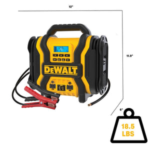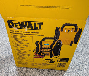 The DEWALT DXAEPS14 professional grade power station is one of our most powerful jump starters with 2000 peak amps to jump start vehicles up to V8. It features a 500-Watt AC inverter, 15W USB-A Port,USB-C 25W PD Port, 120 psi digital compressor and LED work light all in a portable package. It's perfect for tailgating, camping trips or roadside assistance. It doesn't matter whether your car won't start, your phone battery is dying or your tire's running flat the DXAEPS14 is the perfect tool for the job.. 2000 peak amps to jump start cars & small trucks up to V8. 15-Watt USB-A and 25-Watt USB-C ports. 120 psi digital compressor for tires and sports equipment. With 2000 peak battery amps the DXAEPS14 will instantly start most cars and trucks, up to V8 without the need for another vehicle. 15-Watt USB-A and USB-C 25W PD ports to charge devices on the go. Just attach the brass-tipped Sure Fit nozzle to your tire's valve stem, select the desired air pressure and the compressor will automatically shut itself off once it's finished, sports needle included. Featuring true reverse polarity protection to assure that jumper cables are connected correctly. 500-Watt AC inverter to power small electronics on the jobsite, campsite, tailgating and more. Easily recharge the unit with the onboard AC Adapter and included AC adapter plug. Compressor features a new 10 minute auto shut off timer to avoid damage from heat, should the compressor be left on unintentionally or unattended. Click here for more information on Electronic Recycling Programs . Cable gauge: 6. Charger type: AC. Features: Accessory Outlets,Reverse Polarity Protection. Included Parts: Air Compressor,Work Light. Peak Amps: 2000. Product Weight (lb.): 19.25 lb. Recharge time (min.): 600. Reserve capacity (Ah): 0. Starting current (amps): 2000. Certifications and Listings: ETL Listed,FCC Listed. Cord Length (in.): 24 in. Product Depth (in.): 13.5 in. Product Height (in.): 12.9 in. Product Width (in.): 6.8 in