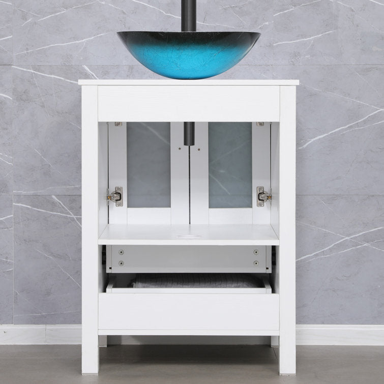 Urban and luxurious, this bathroom vanity set with vessel sink set adds a contemporary vibe and practical storage to your bath. The collection's contrasting textures include a panel shelf and smooth wood grid tops. Cupboard doors with 2 drawers and large storage space are very suitable for your bathroom. Handcrafted from tempered glass by skilled artisans, each of the vessel sinks is a functional work of art that complements the transitional and modern bathroom alike. The high-quality tempered glass/ceramic is very easy to clean and keeps bright for long-lasting beauty. Coupled with a faucet, this basin will be an astonishing focal point to refresh your bathroom. Recommend to you. Product Type: Single Vanity Countertop Material: Manufactured Wood Base Material: Manufactured Wood Finished Back: No Sink Included: Yes Sink Shape: Square Number of Sinks Included: 1 Sink Location: Center Doors Included: Yes Drawers Included: Yes Soft Closing: Soft Close Door Hinges Faucet Included: Yes Number of Faucets Included: 1 Compatible Faucet Installation Type: Vessel Mirror Included: No Backsplash Included: No Shelves Included: Yes Number of Shelves: 1 Mounting Bracket Included: No P-Trap Included: No What is a P-Trap?: A p-trap holds water to prevent sewer gases from entering the home through the drain. It also traps debris that has drained from the sink to prevent the plumbing system from being clogged. Drain Assembly Included: Yes What is a Drain Assembly?: A drain assembly connects the sink to the P-Trap. It enables the faucet to function with the sink to drain or trap water in the basin. Cabinet Hardware Included: Yes Hardware Material: Zinc Standalone Bathroom Cabinet or Shelving Included: Yes Imported: Yes Durability: Rust Resistant; Water Resistant Hardware Finish: Zinc Overflow Hole: No