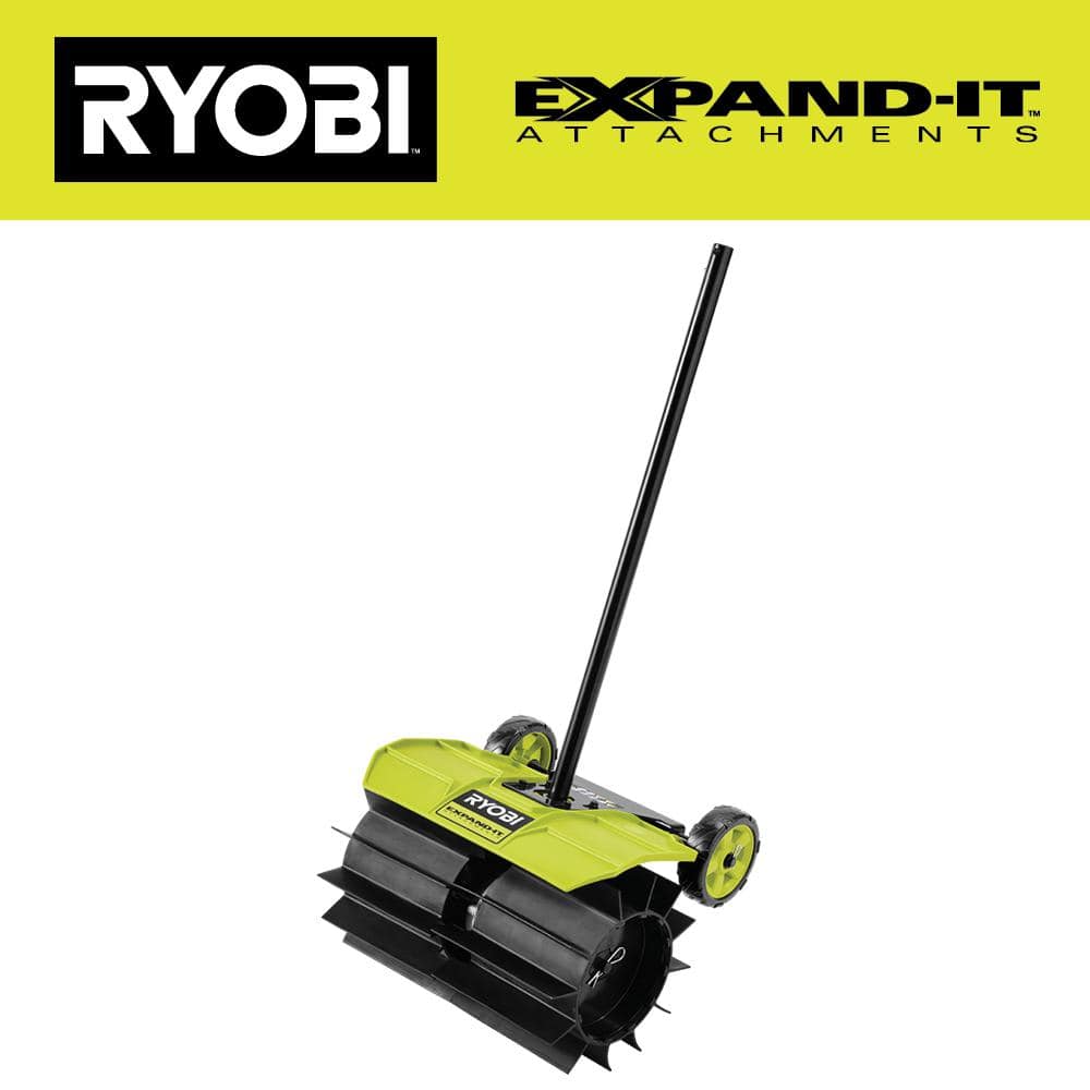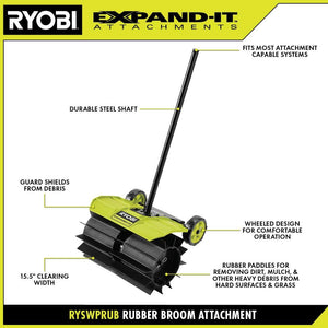 Expand your RYOBI system with the RYOBI EXPAND-IT Rubber Broom Attachment. As part of the RYOBI EXPAND-IT Attachment System, easily transform your attachment capable string trimmer into a rubber broom saving money, time, and space. This rubber broom removes dirt, mulch, & other heavy debris with its rubber paddles from hard surfaces & grass. With a 15.5 clearing width, you can quickly get the job done. It's equipped with a durable steel shaft, a guard to shield from debris, and wheels for comfortable transport and operation. The RYOBI EXPAND-IT Rubber Broom Attachment is compatible with most gas & cordless attachment capable systems. Features: Attachment Capable. Fits Brands: Compatible with Multiple Brands. Fits Models: RY40290VNM, RY40270VNM, RY40230, RY40226, RY41135, RY40561, RY40770, RY40250. Product Depth (in.): 15 in. Product Height (in.): 38 in. Product Width (in.): 15.5 in.