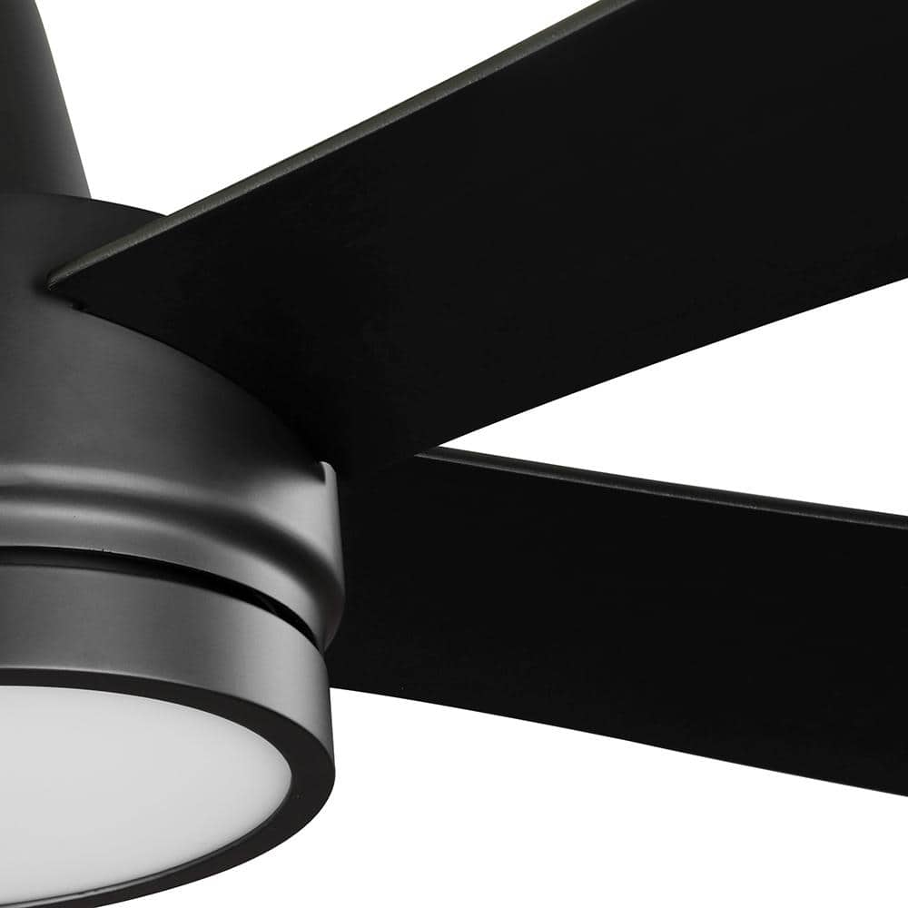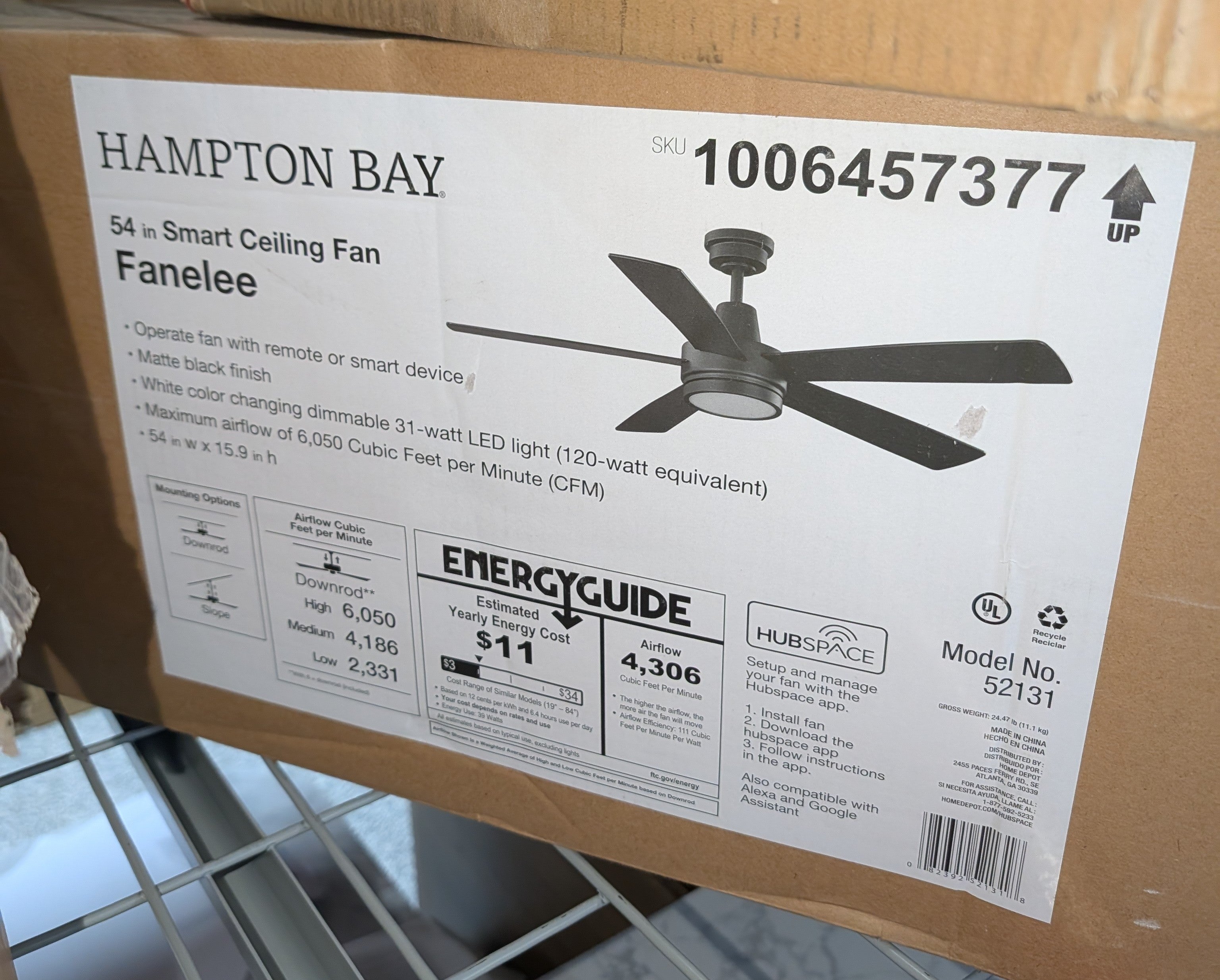 The 54 in. Fanelee Smart Ceiling Fan from Hampton Bay is the perfect way to add a ceiling fan to your smart home ecosystem. This fan offers a variety of control options: remote control (included), control via your smart device (phone or tablet) with the HubSpace App or voice control with Alexa or Google Assistant. The integrated 31-Watt LED offers ample lighting and the ability to choose from 6 different light temperature settings ranging from 2700K to 6500K. The stark matte black finish is complemented with a frosted shatter resistant plastic shade that mimics frosted glass with the added benefit of not breaking if dropped during cleaning. Designed for indoor use in large rooms, the Fanelee features a quiet, yet powerful, 4-speed reversible motor for year-round comfort.. Actual Color Temperature (K): 2700,3000,3500,4000,5000,6500. Blade Color: Wenge;Matte Black. Blade Color Family: Black,Brown. Blade Material: Plywood. Blade Pitch: 12. Blade Span (in.): 54 in. Ceiling Fan Design: Standard. Color Temperature: Adjustable White. Commercial/Residential: Residential. Control Type: App,Remote,Voice. Damp/Wet Rating: Dry Rated (Indoor). Dimmable Capability: Dimmable. Durability: Not Applicable. Features: Dimmable,Quick & Easy Install,Reversible Blades,Reversible Rotation,Timer. Housing Color: Matte Black. Housing Color Family: Black. Housing Material: Steel. Included: Downrod Included,Light Bulb(s) Included,Light Kit Included,Remote Control Included,Shade(s) Included. Indoor/Outdoor: Indoor. Light Bulb Type Included: Integrated LED. Location Use: Bedroom,Foyer,Kids Room,Living Room,Nursery,Office. Lumens: 1600. Max. Airflow (CFM): 6050. Max. Motor Speed (RPM): 160. Motor Type: AC. Mounting Type: Angled Mount,Downrod Mount. Number of Blades: 5. Number of Lights: 1. Number of Speeds: 4. Power Options: Hardwired. Recommended Room Size: Large Room (400 sq. ft.). Remote Access: Remote Access. Requires Hub?: No Hub Required. Shade Material: Plastic. Shade Shape: Round. Smart Device Enabled: Enabled. Smart Home: Smart Home Enabled. Smart Home Protocol: Bluetooth,Wi-Fi. Style: Modern,Transitional. Voice Control Hub Required: No Hub Required for Voice Control. Watt Equivalence: 120. Works With: Alexa, Alexa, Google, Google, Google Assistant, Hubspace. Certifications and Listings: FCC Listed,UL Listed. Assembled Depth (in.): 54.00 in. Assembled Height (in.): 15.90 in. Assembled Weight (lbs.): 19.18. Assembled Width (in.): 54.00 in. Blade Length (in.): 23.9 in. Blade Width (in.): 5.9 in. Downrod Length (in.): 6. Blade Span (in.): 54 in. Number of Blades: 5. Recommended Room Size: Large Room (400 sq. ft.). Max. Airflow (CFM): 6050. Mounting Type: Downrod Mount. Mounting Type: Angled Mount. Features: Dimmable. Indoor/Outdoor: Indoor