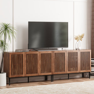 This Farmhouse TV stand lies in its unique design that seamlessly merges rural charm with modern elegance. The cabinet's brown surface exudes a warm and inviting ambiance, perfectly capturing the essence of a cozy country home. The grating door design adds a touch of rustic style, while also allowing for easy access to the storage compartments. Product Type: TV Stand Cabinets Included: Yes Shelves Included: Yes Material: Manufactured Wood; Iron Vents: Yes Tipover Restraint Device Included: No Swivel: No Adjustable Height: Yes Imported: Yes Weight Capacity: 350 Color / Finish: Brown