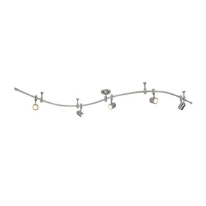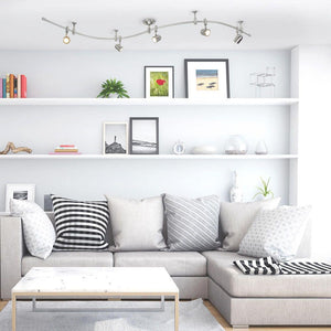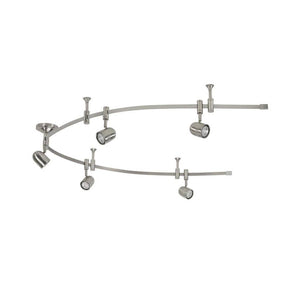 Furnish your room with distinct illumination with this versatile 5-light flexible track light. 5 fully adjustable shades and a flexible track bar allow you to customize the directional light where you need it most. This versatile lighting kit combines function with modern design. Updating the light fixtures in your home is the most effective way to accomplish an alluring, yet simple, DIY remodel.. Compatible Bulb Type: LED. Damp/Wet Rating: Dry Rated. Features: Bulb Included. Fixture Color Family: Nickel. Fixture Color/Finish: Brushed Nickel. Hardware Included: Yes. Light Bulb Base Code: GU10. Max. Bulb Wattage (W): 25 W. Mount Location: Ceiling Mounted. Mounting Hardware Included: Yes. Movable fixtures: Yes. Number of Tracks: 1. Power Source: Hard Wired. Product Weight (lb.): 4.3 lb. Recommended Light Bulb Shape Code: MR16. Shade Color Family: Polished Nickel. Track Head Type: Pinhole Head. Track Length (ft.): 8 ft.. Track Lighting Type: Flexible Track. Voltage (v): 120v. Certifications and Listings: ETL Listed. Product Depth (in.): 96 in. Product Height (in.): 8.70 in. Product Width (in.): 4.38 in. Track Length (ft.): 8 ft.. Compatible Bulb Type: LED. Mount Location: Ceiling Mounted. Track Lighting Type: Flexible Track. Features: Bulb Included. Power Source: Hard Wired. Track Head Type: Pinhole Head
