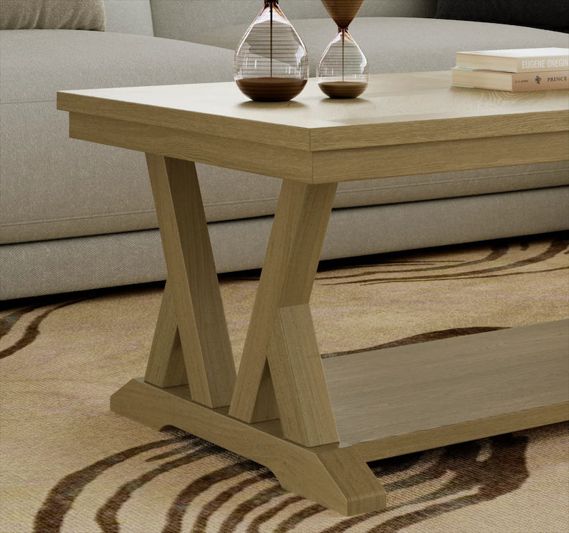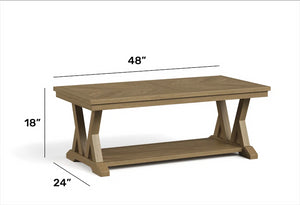 Elevate your living space with the Flexsteel Lattice Coffee Table, a perfect blend of strength, style, and craftsmanship. Designed with a farmhouse-inspired lattice base and a durable solid wood frame, this table offers both beauty and functionality. Its warm oak finish highlights the natural grain, creating a cozy and inviting centerpiece for your living room. Ideal for modern, rustic, or transitional interiors, the table provides ample surface space for d cor, drinks, or magazines plus a sturdy lower shelf for added storage. Built by Flexsteel, a trusted name in quality furniture, this piece combines durability with timeless design. Features: Crafted from high-quality solid and engineered wood Rustic oak veneer finish complements any d cor Sturdy lattice cross-leg design for added stability Spacious tabletop and lower shelf for display or storage Dimensions: 18 H x 48 W x 28 D