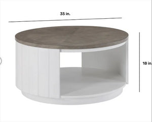 Bring timeless charm and practical design to your living room with the Flexsteel Melody 35 Round Coffee Table. Crafted from rubberwood solids and white oak veneers, this elegant piece features a subtly distressed white base paired with a gray parquet top for a beautiful two-tone look that complements any d cor. The spacious lower shelf provides convenient storage for books, d cor, or everyday essentials, while hidden casters make it easy to move. Perfect for modern farmhouse or transitional spaces, this table combines Flexsteel s trusted craftsmanship with versatile style.