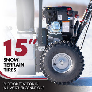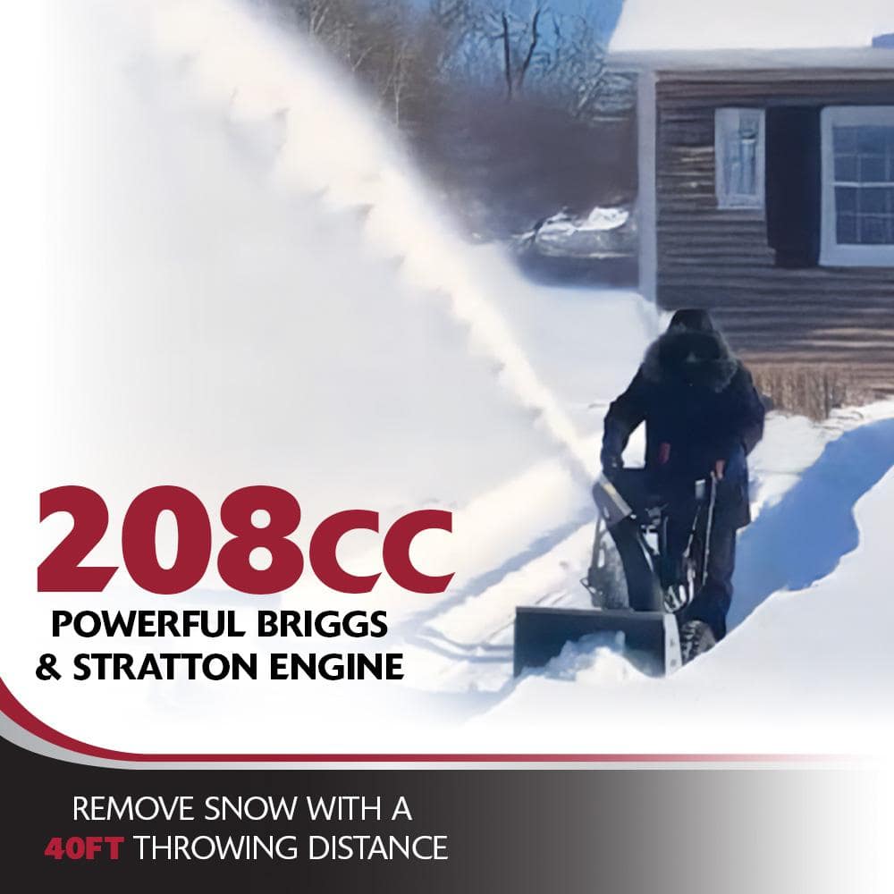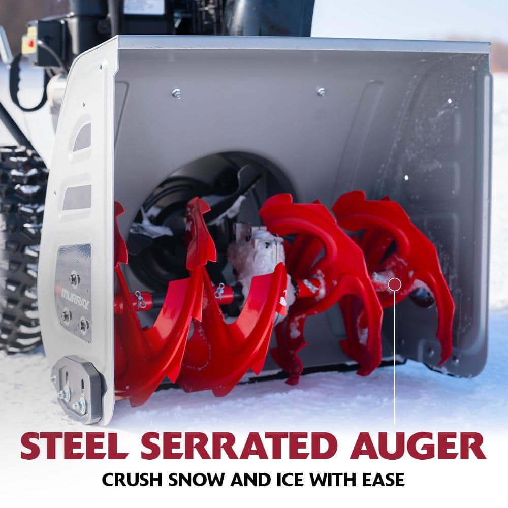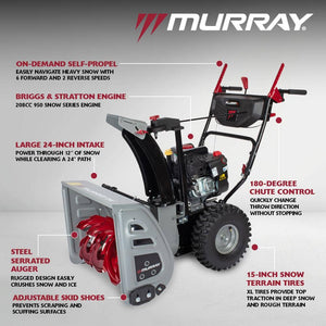 Be prepared for winter's worst with the Murray Flurry XL Two-Stage Snow Blower. Powered by Briggs & Stratton 208cc 950 Snow Series engine, this powerful dual stage snow blower features a rugged steel auger and an 8-speed self-propelled system, making it the best snow blower for heavy snow.Designed for heavy-duty snow removal , the Flurry XL clears a 24-inch-wide, 12-inch-deep path, effortlessly throwing snow up to 40 feet. It's user-friendly operation offers a recoil or electric start, forward and reverse propulsion, and 180 chute rotation for customizable snow throwing. With a compact design, robust 15-inch Snow Terrain tires, and the ability to clear both gravel and paved driveways, this 2-stage snow blower is the ultimate snow removal machine. Where powerful performance meets unbeatable value-Murray makes it easy to get the job done so you can enjoy your winter fun.. Assembly Required: Yes. Auger Material: Steel. Body Material: Metal. Chute Material: Steel. Chute Turning Radius (Degrees): 180. Clearing Surface Type: Gravel,Paved. Drive Type: Self-Propelled. Engine Displacement (cc): 208. Engine Make: Briggs and Stratton Engine. Engine Torque (ft.-lb.): 9.5. Features: Belt Drive,Chute Control,Electric Start,Friction Disc,Remote Deflector Control,Skid Shoes,Steel Chute,Variable Speed. Fuel Tank Capacity (gal.): .8 gal. Maximum Throwing Distance (ft.): 40. Number of Forward Speeds: 6. Number of Reverse Speeds: 2. Oil Capacity (oz.): 20 fl oz (US). Pitch Control: Crank. Plowing Capacity (lbs/min): 2700. Power Type: Gas. Product Weight (lb.): 180.8 lb. Recommended Oil Type: 5w30. Recommended Terrain: Flat,Sloped,Uneven. Refurbished: No. Snow Equipment Product Type: Two Stage Gas Snow Blower. Stage Type: Two-Stage. Start Type: Electric. Traction: Wheel Drive. Type of Snow: Fluffy,Heavy,Light,Wet. Certifications and Listings: UL Certified. Assembled Depth (in.): 52.7 in. Assembled Height (in.): 44.4 in. Assembled Width (in.): 26.1 in. Auger Diameter (in.): 12. Clearing Width (in.): 24 in. Ideal Snow Depth (In.): 12. Impeller Diameter (in.): 12. Intake Height (in.): 20. Tire Height (in.): 15. Tire Width (in.): 5. Clearing Surface Type: Gravel,Paved. Engine Make: Briggs and Stratton Engine. Snow Equipment Product Type: Two Stage Gas Snow Blower. Stage Type: Two-Stage. Clearing Width (in.): 24 in. Features: Electric Start. Features: Chute Control. Features: Variable Speed