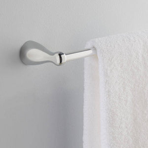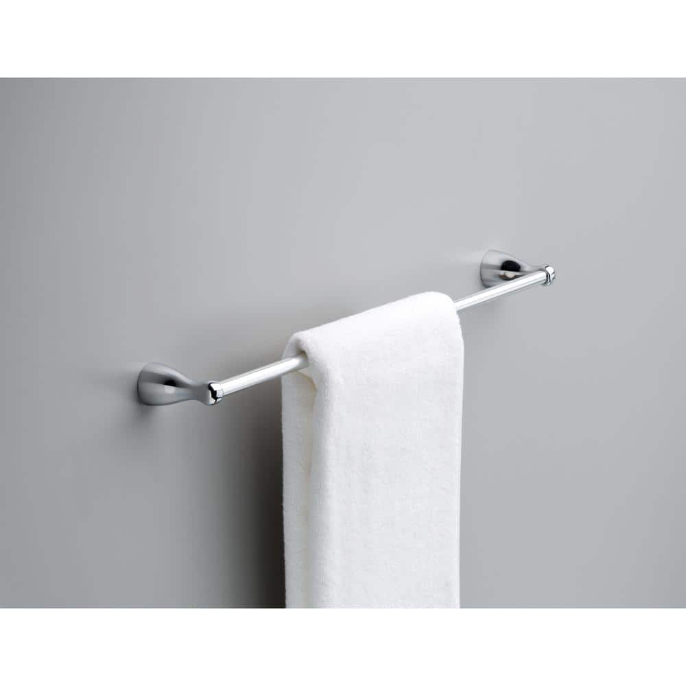 Simple, yet cleanly defined curves make the Foundations bath collection a well-suited accent to any bathroom decor. This 24 in. towel bar compliments your bathroom perfectly with its smooth and seamless lines. Designed with a clean look in mind, this collection will beautifully update your bathroom. Finish your look today with coordinating pieces from the Foundations collection (sold separately). Wall mounted design for bathroom convenience and organization. Polished chrome finish provides sleek sophistication that makes any room pop. Has durable, long-lasting finish to help prevent corrosion, tarnish or discolor, so you can enjoy a look you'll love for life. Crafted from high quality zinc die cast for long term use. Perfect for holding 1 larger towel or multiple folded hand towels to make the most out of your space. Complete your look with complimenting pieces from the Foundations bath collection. Features set screw mounting system for added durability. Comes with mounting hardware and guide for easy installation. Matches perfectly with the Delta foundations faucet. Product Length (in.): 24 in. Finish Family: Polished Chrome. Number of Towel Holders: Single. Mount Post Shape: Round. Towel Holder Type: Body Towel Holder. Mount Type: Wall Mounted. Style: Modern. Weight Capacity (lb.): 15 lb.