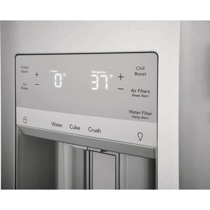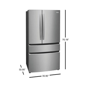 This FRIGIDAIRE GALLERY French door refrigerator maintains the taste and texture of even your most delicate foods. Our freshness system is packed with technologies that keep food fresh. Reduce food waste and increase freshness with our cooling system, advanced crispers, and our genuine air and water filtration.. Crispers keep produce fresh with 3 advanced technologies. Maximize usable space with our clever organization system. Switch from fridge to freezer with the Custom-Flex Temp Drawer. Crispers keep produce fresh with 3 advanced technologies. Maximize usable space with our clever organization system. Switch from fridge to freezer with the Custom-Flex Temp Drawer. Packed with technologies that reduce food waste and energy consumption, our refrigerator is a smart option for the environment and your wallet. Keep safer, great tasting water flowing and reduce up to 99% of contaminants while cutting back on plastic and the cost of bottled water with our water filter. Our cooling system ensures temperature and airflow distribution is even in both the refrigerator and freezer, this minimizes common issues, such as freezer burn and warm spots. Compatible with air filter model : FRGPAAF2 . Easily access your favorites - reach up to 75% of your food with only one door open. Smudge-Proof Stainless Steel resists fingerprints and cleans easily. Use our crisper to keep your produce fresh for longer, or flip it around to use as an open compartment to easily access items such has beverages, yogurts or snacks. Our counter-depth refrigerator sits flush with existing cabinetry, making it easy to achieve a sleek, built-in look without the hassle of remodeling. Enhanced bright LED lighting illuminates every level on the inside, and our ambient pocket handle offers an ambient light for your kitchen. Our air filter performs better than baking soda, capturing undesirable smells to keep your fridge fresh for longer. Avoid spoiled food with our auto-close doors, which ensure your doors are never left slightly open by automatically closing once the door is ajar 5 in. or less. Compatible water filter model: FPPWFU02. Awarded editor's choice french door refrigerator of 2023 by reviewed.com (USA today). Click here to shop all Frigidaire appliances . Click here for more information on Electronic Recycling Programs . Appliance Category: Refrigerator. Appliance Series: Frigidaire Gallery. Appliance Type: French Door Refrigerator. Built-In and Standard Type: French Door. Color - Appliance Cabinet: Gray. Color - Door Handle(s): Smudge-Proof Stainless Steel. Color/Finish: Smudge-Proof Stainless Steel. Color/Finish Family: Stainless Steel. Defrost Type: Frost Free. Dispenser Location: External Ice Dispenser,External Water Dispenser. Door Finish: Smooth. Energy Consumption (kWh/year): 668. Energy Efficiency Tier Rating: Not CEE rated. Freezer Capacity (cu. ft.): 5.8 cu ft. Freezer Door Type: Pull Out Drawer. Freezer Features: LED Light Type. Freezer Type: Drawer Freezer. General Features: Child Lock,Dispenser Light,Door Alarm,Interior Light,LED Light Type,Sabbath Mode,Smudge-Proof. Handle Type: Bar Handle. Hardware Color/Finish: Stainless Steel. Hardware Color/Finish Family: Stainless Steel. Ice Maker Features: Control Lockout,Filtered Ice,Ice Maker. Ice/Water Dispenser: Both. Indoor/Outdoor: Indoor. Installation Depth: Counter Depth. Installation Type: Free Standing. Number of Doors: 4 Door. Number of Drawers: Double Drawer. Number of Freezer Baskets/Bins: 1 Basket/Bin. Number of Freezer Shelves: 1 Shelf. Number of Refrigerator Shelves: 3 Shelves. Operational Features: Convertible Freezer,Dual Evaporated Cooling System,Fresh Air Filter,Humidity Controlled Crisper,Sabbath Mode,Self-Closing Door. Product Weight (lb.): 313 lb. Refrigeration Dispenser Features: Crushed Ice,Cubed Ice,Dispenser Control Lock-Out,Filtration Replacement Indicator Light,Water Dispenser. Refrigerator Capacity (cu. ft.): 13.1 cu ft. Shelf Material - Freezer: Glass. Shelf Material - Refrigerator: Glass. Storage Features: Adjustable Door Storage,Adjustable Shelves/Racks,Crisper Drawer,Gallon Door Storage. Temperature Control Type: Internal Digital. Total Capacity (cu. ft.): 21.5 cu ft. Water Filter Replacement Model#: FPPWFU02. Certifications and Listings: CSA Listed,Energy Star. Depth (Excluding Handles) (in.): 29.5 in. Depth (Including Handles) (in.): 32 in. Depth (Less Door) (in.): 24.6 in. Depth With Door Open 90 Degrees (in.): 46.9 in. Height to Top of Door Hinge (in.): 70.2 in. Height to Top of Refrigerator Case (in.): 69.1 in. Height to Top of Refrigerator Door (in.): 70.2 in. Product Depth (in.): 32 in. Product Height (in.): 70.2 in. Product Width (in.): 35.9 in. Refrigerator Width (in.): 35.9 in