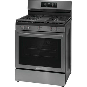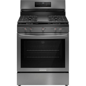The Frigidaire Gallery 30 Rear Control Gas Range features our most powerful and advanced convection system, Total Convection, enabling so many cooking modes like No Preheat, Air Fry, Slow Cook, Steam Bake, Steam Roast, Air Sous Vide, Convection Roast, Convection Bake and more! The flexible five burner cooktop includes a powerful 18,000 BTU Quick Boil Burner and a center oval burner with an integrated cast iron griddle. Also includes our fingerprint resistant finish.. Appliance Category: Range. Appliance Series: Frigidaire Gallery. Appliance Type: Gas Range. Burner Grate Material: Cast Iron. Burner No.1 BTU: 18000. Burner No.2 BTU: 5000. Burner No.3 BTU: 14000. Burner No.4 BTU: 10000. Burner No.5 BTU: 10000. Capacity of Oven (cu. ft.): 5.1 cu ft. Cleaning Type: Self Cleaning. Color of Cooktop: Black. Color/Finish: Smudge-Proof Black Stainless Steel. Color/Finish Family: Black Stainless Steel. Commercial/Residential: Residential. Control Type: Electronic. Controls Location: Back Control. Cooktop Features: Continuous Grates,Digital Display,LP Convertible,Melting Burner,Sealed Burners,With Griddle. Cooktop Surface Type: Burner Grate. Drawer Type: Lower Storage Drawer. Fuel Type: Gas. Hardware Color/Finish: Black Stainless Steel. Hardware Color/Finish Family: Black Stainless Steel. Ignition Type: Electrical. Included: Bulb(s),Power Cord. Number of Burners: 5 burner. Number of Oven Racks: 2. Number of Rack Positions: 6. Oven Cleaning Options: Delay Clean,Self-Cleaning,Steam Clean. Oven Cooking Process: Air Fry,Air Sous Vide,Steam Oven,True Convection. Oven Features: Adjustable Leg Heights,Automatic Convection Conversion,Broiler in Oven,Delay Bake/Delay Start,Fingerprint Resistant,LED Display,Oven Light,Oven Temperature Probe,Sabbath Mode,Safety Lock. Product Weight (lb.): 190 lb. Range Installation Type: Freestanding. Returnable: Non-Returnable. Certifications and Listings: CSA Listed. Depth With Door(s) Open 90 Degrees (in.): 47.3125 in. Oven Interior Depth (in): 19.875. Oven Interior Height (in): 17.625. Oven Interior Width (in): 25.1875. Product Depth (in.): 26 in. Product Height (in.): 47.75 in. Product Width (in.): 30 in. Range Size (Width): 30 in.. Range Size (Width): 30 in.. Range Installation Type: Freestanding. No of Burners: 5 burner. Capacity (cu. ft.): 5.1 cu ft.. Capacity (cu. ft.): 5.1 cu ft. Cleaning Type: Self Cleaning. Oven Cooking Process: Air Fry. Drawer Type: Lower Storage Drawer