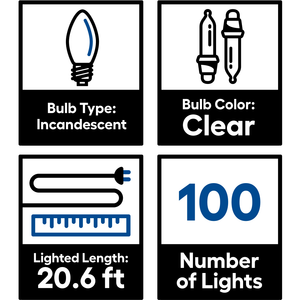 GE String-A-Long incandescent 5-mm miniature 100-count clear light set. 3-Inch lead wire, 2.5-inch lamp spacing, 3-inch end connector, 20.6-feet lighted length, and green cord with fused plug. GE 5-mm incandescent Christmas string lights 100-Count, clear incandescent lights 20.6-Feet lighted length, green cord with fused plug Can connect up to 5 sets Replacement bulbs and fuses included for added convenience For indoor or outdoor use Bulb Finish: Transparent Color-Changing: No Cord Color: Green Light Color: Clear Light Color Name: Clear Multicolor: No Series Name: String-A-Long Bulb Diameter (Millimeters): 5.0 Cord Lead Length (Inches): 3.0 Lighted Length (Feet): 20.6 Bulb Spacing (Inches): 2.5 Bulb Style: Mini Bulb Type: Incandescent Commercial/Residential: Residential Copper Wire String: Yes Indoor/Outdoor: Indoor/Outdoor Licensed: No Light Pattern: Constant Light Projector: No Lowe's Exclusive: No Maximum Linkable Strands: 5 Musical: No Number of Lights: 100 Occasion: Christmas Plug at Both Ends: Yes Power Source: Electrical outlet Replacement Bulbs and Fuses Included: Yes Season: Winter Timer: No White Light Shade: Clear CA Residents: Prop 65 Warning(s): No ENERGY STAR Certified: No File/Certification Number: E-63536 Safety Listing: UL safety listing UNSPSC: 39111900