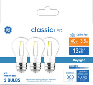 Our Daylight LED 40-Watt Replacement Clear Ceiling Fan light bulb offers outstanding energy efficiency, long-lasting performance and just-right brightness, all in one package. It s dimmable and illuminates your home with cool, bright light. Use this medium-base LED in ceiling fans. Thanks to its aesthetic design, our Daylight LED 40-Watt Replacement Clear light bulb compliments your fixture and adds a decorative touch even when the light is off. When it s turned on, its long life and low energy use will help you save money on energy. - 40 Watt replacement using only 3.5 Watts (300 lumens) - Rated to last 13 years based on 3 hours per day use - Saves 60 dollars on energy costs per bulb versus 40-Watt incandescent over the bulb's life - Dimmable and works with most dimmer switches - Cool, bluish white daylight light with 5000 Kelvin color temperature - 3 LED bulbs per package - A15 shape and size with clear finish - Medium base (E26) - General purpose bulbs for ceiling lights, ceiling fans and pendant lights - Bulb Finish: Transparent - Color Rendering Index (CRI): 80 - Color Temperature (Kelvins): 5000 - Light Color: Daylight - Sub-Brand: Classic - Type: General purpose - Bulb Diameter (Inches): 1.9 - Length (Inches): 2 - 3 Way: No - Battery Back-Up: No - Blacklight: No - Built-In Speakers: No - Bulb Material: Glass - Bulb Shape: A-style - Bulb Shape Code: A15 - Bulb Type: LED - Dimmable: Yes - Dusk-to-Dawn Sensor: No - Edison: No - Enclosed Fixture Rated: No - Energy Efficient: Yes - Filament Style: Straight - Grade: Residential - Hub Required: No - Light Bulb Base Type: Medium base (E-26) - Lowe's Exclusive: No - Lumens: 300 - Motion Sensor(s) Included: No - Package Quantity: 3 - Package Type: Multi-pack - Plug-In Type: Screw-in - Primary Usage: Light fixtures - Rapid Start: No - Rated Life (Hours): 15000 - Remote Control Included: No - Scheduling Ability: No - Shatter Resistant: No - Usage Rating: Damp rated - Use Location: Indoor - Vintage: No - Voice Controlled: No - Volts: 120 - Wattage: 3.5 - Wattage Equivalent: 40 - App Compatibility: No - Bluetooth Compatibility: No - Smart Compatible: No - Wi-Fi Compatibility: No - Works with Amazon Alexa: No - Works with Android: No - Works with Apple HomeKit: No - Works with iOS: No - Works with SmartThings: No - Works with the Google Assistant: No - CA Residents: Prop 65 Warning(s): No - CEC Compliant (CA): No - Encircled E Required on Product or Pkg: No - ENERGY STAR Certified: No - Safety Listing: cULus safety listing - UNSPSC: 39101600