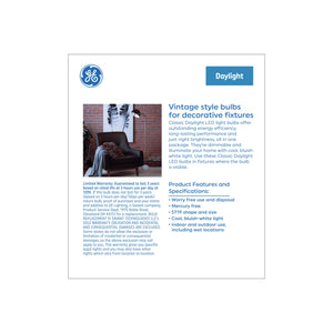 GE Classic Daylight LED 60-Watt Replacement light bulbs offer outstanding energy efficiency, long-lasting performance and just-right brightness, all in one package. They re dimmable and illuminate your home with cool, bluish white light. These are great for frequently used fixtures GE Classic Daylight LED bulbs are rated to last 13 years based on three hours use per day and save 90 dollars in energy costs over the bulb's life versus a 60-Watt incandescent vintage bulb. Unlike CFL bulbs, GE LED bulbs feature instant full brightness and are free of Mercury. Replace CFL and incandescent light bulbs with GE Classic Daylight LED general purpose light bulbs in indoor table lamps, sconces and fixtures, including damp locations. 60-Watt replacement using only 4.5 Watts (500 lumens) Rated to last 13 years based on 3 hours per day use Save 90 dollars on energy costs per bulb versus 60-Watt incandescent vintage bulb over the bulb's life Dimmable and works with most dimmer switches Strong, vibrant yellow high-definition daylight light with 5000 Kelvin color temperature Medium base (E26) Decorative for ceiling lights, wall lights and table lamps Bulb Finish: Transparent Color Rendering Index (CRI): 80 Color Temperature (Kelvins): 5000 Color Temperature Presets/Range: 2700K to 5000K Light Color: Daylight Sub-Brand: Classic Type: Decorative Bulb Diameter (Inches): 2.6 Length (Inches): 5 3 Way: No Battery Back-Up: No Blacklight: No Built-In Speakers: No Bulb Material: Glass Bulb Shape: Straight tapered Bulb Shape Code: ST19 Bulb Type: LED Dimmable: Yes Dusk-to-Dawn Sensor: No Edison: Yes Enclosed Fixture Rated: Yes Energy Efficient: Yes Filament Style: Straight Grade: Residential Hub Required: No Light Bulb Base Type: Medium base (E-26) Lowe's Exclusive: No Lumens: 500 Motion Sensor(s) Included: No Package Quantity: 4 Package Type: Multi-pack Plug-In Type: Screw-in Primary Usage: Light fixtures Rapid Start: No Rated Life (Hours): 15000 Remote Control Included: No Scheduling Ability: No Shatter Resistant: No Tube Length (Inches): 0 Usage Rating: Wet rated Use Location: Indoor Vintage: Yes Voice Controlled: No Volts: 120 Wattage: 4.5 Wattage Equivalent: 60 App Compatibility: No Bluetooth Compatibility: No Smart Compatible: No Wi-Fi Compatibility: No Works with Amazon Alexa: No Works with Android: No Works with Apple HomeKit: No Works with iOS: No Works with SmartThings: No Works with the Google Assistant: No CA Residents: Prop 65 Warning(s): No CEC Compliant (CA): No Encircled E Required on Product or Pkg: No ENERGY STAR Certified: No Safety Listing: cULus safety listing UNSPSC: 39101600