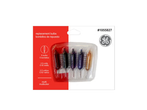 GE miniature replacement bulbs in assorted colors and assorted fuses. Available only at Lowe's. GE 2.5-volt replacement bulbs available in clear, transparent red/blue/green/multicolor GE replacement assorted fuses Available only at Lowe's Bulb Finish: Transparent Color Rendering Index (CRI): 0 Light Color: Assorted Product Type: Assorted string light bulbs and fuses Bulb Shape: Assorted Bulb Style: Mini Bulb Type: Incandescent Commercial/Residential: Residential Dusk-to-Dawn Sensor: No Edison: No Enclosed Fixture Rated: No Lowe's Exclusive: Yes Motion Sensor(s) Included: No Package Quantity: 104 Usage Rating: Not rated Use Location: Indoor/Outdoor White Light Shade: Clear (incandescent) CA Residents: Prop 65 Warning(s): No UNSPSC: 39111600