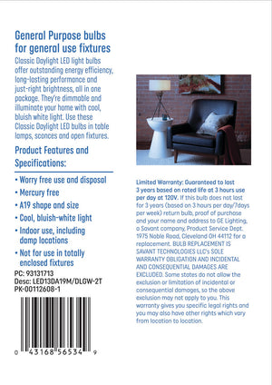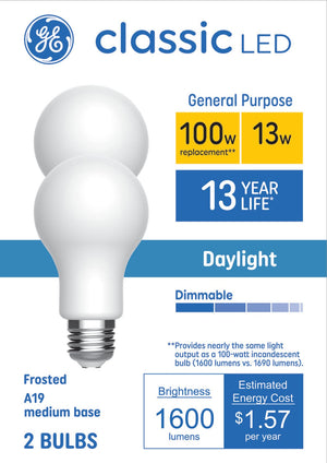 Our LED light bulbs offer outstanding energy efficiency, long-lasting performance and just-right brightness, all in one package. They illuminate your home with daylight. Unlike CFL bulbs, our LED bulbs feature instant full brightness and are free of Mercury. It s great for frequently used fixtures our LED's long life and low energy use will help you save money on energy. 100 Watt replacement using only 13 Watts (1600 lumens) Rated to last 13.7 years with an annual operation cost of 1.57 dollars based on 3 hours per day use at 11 cents per KwH Dimmable and works with most dimmer switches Cool, bluish white daylight light with 5000 Kelvin color temperature Includes 2 A19 shape and size LED bulbs with E26 base and frost finish Bulb Finish: Frosted Color Rendering Index (CRI): 80 Color Temperature (Kelvins): 5000 Light Color: Daylight Series Name: Classic Type: General purpose Bulb Diameter (Inches): 2.39 Length (Inches): 4.38 3 Way: No Battery Back-Up: No Blacklight: No Built-In Speakers: No Bulb Material: Glass Bulb Shape: A-style Bulb Shape Code: A19 Bulb Type: LED Dimmable: Yes Dusk-to-Dawn Sensor: No Edison: No Enclosed Fixture Rated: No Energy Efficient: Yes Grade: Commercial/Residential Hub Required: No Light Bulb Base Type: Medium base (E-26) Lowe's Exclusive: No Lumens: 1600 Motion Sensor(s) Included: No Package Quantity: 2 Package Type: Multi-pack Plug-In Type: Screw-in Primary Usage: Light fixtures Rapid Start: No Rated Life (Hours): 15000 Remote Control Included: No Scheduling Ability: No Shatter Resistant: No Tube Length (Inches): 0 Usage Rating: Damp rated Use Location: Indoor Vintage: No Voice Controlled: No Volts: 120 Wattage: 13 Wattage Equivalent: 100 App Compatibility: No Bluetooth Compatibility: No Smart Compatible: No Wi-Fi Compatibility: No Works with Amazon Alexa: No Works with Android: No Works with Apple HomeKit: No Works with iOS: No Works with SmartThings: No Works with the Google Assistant: No CA Residents: Prop 65 Warning(s): No CEC Compliant (CA): No Encircled E Required on Product or Pkg: No ENERGY STAR Certified: Yes Safety Listing: cULus safety listing UNSPSC: 39101600