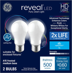GE High Definition bulbs are an improved, energy-saving LED that enhance the appearance of colors. Experience the difference with bolder colors and enhanced contrast vs. standard GE LED bulbs. Reveal filters dull yellow light to give you the incredible color contrast plus whiter whites for exceptional clarity. Reveal illuminates your home with clean, beautiful light. Use reveal pure, clean light in kitchens, bathrooms as well as craft & hobby spaces where clarity matters most. 60 Watt replacement using only 5 Watts (500 lumens) Rated to last 13 years based on 3 hours per day use Saves 90 dollars on energy costs per bulb vs 60-Watt incandescent over the bulb's life Dimmable and works with most dimmer switches Pure, clean high definition plus light with 2700 Kelvin color temperature 2 LED bulbs per package A15 shape and size with frosted finish Medium base (E26) General purpose bulbs for ceiling lights, ceiling fans and pendant lights Bulb Finish: Frosted Color Rendering Index (CRI): 80 Color Temperature (Kelvins): 2700 Light Color: Color-enhancing Series Name: Reveal HD Type: General purpose Bulb Diameter (Inches): 2.1654 Length (Inches): 3.5 3 Way: No Battery Back-Up: No Blacklight: No Built-In Speakers: No Bulb Material: Glass Bulb Shape: A-style Bulb Shape Code: A15 Bulb Type: LED Dimmable: Yes Dusk-to-Dawn Sensor: No Edison: No Enclosed Fixture Rated: Yes Energy Efficient: Yes Grade: Commercial/Residential Hub Required: No Light Bulb Base Type: Medium base (E-26) Lowe's Exclusive: No Lumens: 500 Motion Sensor(s) Included: No Package Quantity: 2 Package Type: Multi-pack Plug-In Type: Screw-in Primary Usage: Light fixtures Rapid Start: No Rated Life (Hours): 15000 Remote Control Included: No Scheduling Ability: No Shatter Resistant: No Tube Length (Inches): 0 Usage Rating: Wet rated Use Location: Indoor Vintage: No Voice Controlled: No Volts: 120 Wattage: 5 Wattage Equivalent: 60 App Compatibility: No Bluetooth Compatibility: No Smart Compatible: No Wi-Fi Compatibility: No Works with Amazon Alexa: No Works with Android: No Works with Apple HomeKit: No Works with iOS: No Works with SmartThings: No Works with the Google Assistant: No CA Residents: Prop 65 Warning(s): No CEC Compliant (CA): No Encircled E Required on Product or Pkg: No ENERGY STAR Certified: No Safety Listing: cULus safety listing UNSPSC: 39101600