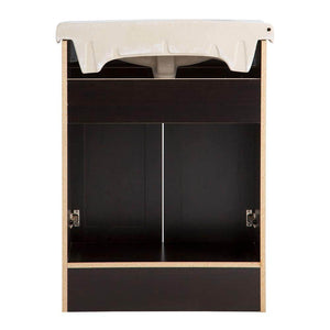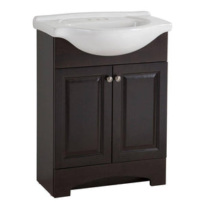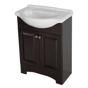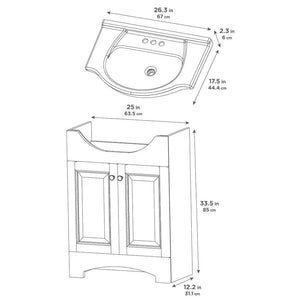 The 26.38 in. W Chelsea bathroom vanity in charcoal includes a 2-door cabinet, ornate brushed nickel cabinet door pulls, and a white porcelain vanity top. This freestanding vanity features full-overlay raised-panel cabinet doors with beveled detailing finished in a dark cool gray that's complemented with a porcelain belly bowl sink top for a classic look. The sink top includes an integrated backsplash and is predrilled for the 4 in. center set faucet of your choice. Created with convenience in mind, this pre-assembled single-sink bathroom vanity features an open-back design, 6-way adjustable cabinet hinges, and an unattached vanity top for easy installation. 26.38 in.W x 17.5 in. D x 36.5 in. H vanity w/cultured marble top. Includes hardware and 2-door under-sink cabinet. Includes drop-in belly bowl sink; faucet not included. 26.38 in. W x 17.5 in. D x 36.5 in. H bathroom vanity adds style and storage in small bathrooms and powder rooms. White porcelain vanity top includes an integrated backsplash and is predrilled for a 4 in. center set faucet; faucet and drain sold separately. Belly bowl sink designed without an overflow hole to help promote a bacteria-free environment. Brushed nickel hardware included. 2-door cabinet provides convenient storage and easy access to your plumbing. Full-overlay raised-panel profile with a dark charcoal gray laminate finish for a classic look. Doors include 6-way adjustable hinges for easy door alignment. Single-sink belly bowl vanity top is nonporous, making it bacteria-, mold-, and mildew-resistant. Pre-assembled open-back vanity with unattached sink top is ready and easy to install with silicone caulking; caulking sold separately. Furniture-board construction with a laminate finish. No overflow hole to help promote a bacteria-free environment. Click here to view Home Depot's vanity installation guide . Assembled: Assembled. Backsplash Included: Backsplash Included. Cabinet & Top Assembled weight (lbs): 65. Cabinet Color: Charcoal. Cabinet Color Family: Gray. Cabinet Material: Particle Board. Cabinet Shade: Dark. Faucet Hole Spacing (in.): 4 in. Faucet Hole Spacing. Faucet Included: Faucet Not Included. Hardware Finish Family: Nickel. Included: No Additional Included Components. Mirror Included: Mirror Not Included. Number of Drawers: 0. Number of Shelves Included in Cabinet: 0. Number of Sinks: Single Sink. Sink Color: White. Sink Color Family: White. Sink Location: Center. Sink Material: Porcelain. Sink Shape: Specialty. Sink Type: Integral. Style: Modern, Transitional. Top Color: White. Top Color Family: White. Top Material: Other Material. Top Material: Porcelain. Top weight (lb.): 37.00. Vanity Features: Adjustable Hinges. Vanity Top Edge Type: Top and Bottom Quarter Round. Vanity Type: Freestanding. Backsplash Height (in.): 1. Basin Depth (in.): 8.25. Basin Length (in.): 8.00. Basin Width (in.): 11.75. Cabinet Depth (in.): 12.25. Cabinet Height (in.): 33.50. Cabinet Width (in.): 25.00. Product Depth (in.): 17.5 in. Product Height (in.): 36.02 in. Product Width (in.): 26.38 in. Vanity Top Thickness (in.): 4.00