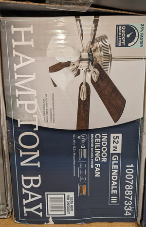 The Hampton Bay Glendale III Brushed Nickel Ceiling Fan features a brushed nickel finish and 5 reversible molasses maple/applewood blades for a handsome transitional look that complements a variety of home decor. The fan offers 3-speed reversible control so you can easily control the speed and airflow. The Glendale III also includes a 3-Light kit with frosted twist-and-lock glass shades and easy operation by use of pull chains. 5 reversible molasses maple/applewood blades. 3-light kit with frosted glass. Three 9-Watt LED bulbs included. Twist-and-lock shade installation method makes it easier to install and conceal hardware. 3-speed reversible control. Tri-mount installation for standard, sloped and flush mount application. Large room: room size over 12 ft. x 12 ft. to 18 ft. x 18 ft. with blade span of 52 in. 4.5 in. ceiling fan extension downrod with 3/4 in. Dia included. Designed for indoor use only. Fan Blade Span (in.): 52 in. Ceiling Fan Size: Medium. Mounting Type: Flush Mount. Number of Lights: 3 Light. Number of Blades: 5 Blades. Indoor/Outdoor: Indoor. Control Type Included: Ceiling Fan Only. Mounting Type: Downrod Mount.
