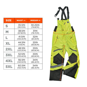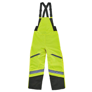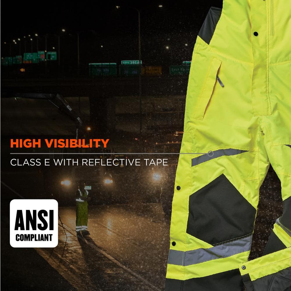 The GloWear 8928 Hi-Vis Insulated Bibs provide conspicuity, warmth and durability for the toughest conditions. Wind resistant, water repellent and built with tough 300D polyester oxford and PU transparent coating for ultimate weather protection. These high visibility overalls are a comfortable ANSI Class E Compliant solution for low light conditions. Rugged scuff-resistant knee patches in high-wear areas provide extra durability and black bottom accents and hide dirt. A front zipper and elastic stretch sides make getting dressed easy and provide extra ventilation when needed. Heavy-duty boot zippers provide convenience of getting the bibs on and off without removing boots. Adjustable suspenders with quick release buckle allow workers to get the perfect fit. There is one chest pocket and 2-side pockets. They all have zippers for extra security in tough environments. These insulated work coveralls are perfect for jobsites in high-traffic areas like road construction or anywhere that requires high visibility clothing. They're also great for activities like snowmobiling, snow shoeing, ice fishing and all your outdoor adventures when its cold and you need to be seen.. Closure Style: Zip Up. Clothing Product Type: Bibs. Color: Lime. Gender: Unisex. Hardware Color Family: Yellow. Inseam: 32. Length: Regular. Material: Polyester (100%). Material: Polyester. Number of Pockets: 3. Origin: Imported. Safety Features: No Safety Features. Size: Large. Size: Unisex Large. Waist Size: 40. Workwear Features: Adjustable,Insulated,Scuff Guard,Water Resistant. Strap Width (in.): 2 in. Waist Size (In.): 40. Waist Size: 40. Inseam: 32