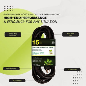 GoGreen Power (GG-13715BK) 16/3 SJTW Outdoor Extension Cord, Black, 15 ft