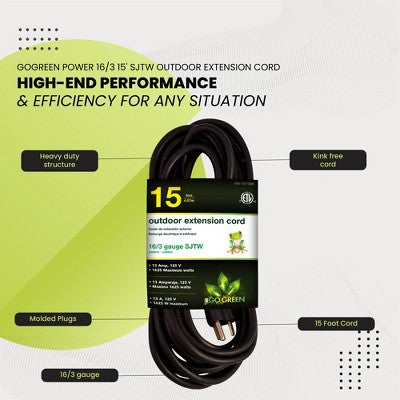 When the going gets tough, the tough gets going, and the GoGreen Power (GG-13715BK) lives up to that! The robust and durable, contractor grade 16/3 SJTW extension cord is ready to rumble, both indoors as well as outdoors. Being moisture resistant, abrasion resistant, and durable, even with prolonged exposure to sunlight, this cord is ETL listed and certified, which is compliant with the rigorous standards for a hard service thermoplastic cable rated for 300 volts. Our heavy duty extension cord doesn't kink, and the molded plugs which gives it a sturdy build, makes it easy to use. This molded plug extension cord is recommended for use with heavy duty equipment and tools, with a maximum of 13 amps and 1625 watts. By purchasing this single-outlet extension cord, you not only will get a high-quality product; but also get ecological peace of mind with hassle-free recycling. Please view the recycling code and instructions on the back of the package and visit our website for additional information. Highlights: Extension Cord: The GoGreen Power (GG-13715BK) is a contractor grade 16/3 SJTW extension cord. 15 Foot Extension Cord: The powerful extension cord is 15 feet long. It is also moisture resistant, abrasion resistant, and durable, even with prolonged exposure to sunlight! Molded Plug Extension Cord: The heavy duty extension cord has molded plugs which gives it a sturdy build and makes it easy to use. Outdoor Extension Cable: The cable is recommended for use with heavy duty equipment and tools, with a maximum of 13 amps, 1625 watts. Size and Other Details: This 16/3 SJTW cable is ETL listed and meets all industry standards. Go Green and follow the instructions located on the products package for recycling (visit the companies homepage for more details) Product manufactured in China and Vietnam Specifications: Dimensions (Overall): 12 inches (L), 1.4 inches (H) x 4 inches (W) Weight: 1.2 pounds Indoor/Outdoor: Outdoor Cable/Cord Length: 15 feet Wire Gauge: 16 AWG Maximum Amperage: 13 amps Number of conductors: 3 Number of outlets: 1
