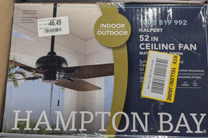 Modern styling and performance combine to create the Halpert 52 in. matte black ceiling fan from Hampton Bay. This outdoor rated fan features 4 weatherproof, textured ABS blades in a beautiful tobacco wicker finish to complement the striking matte black motor housing. Made for the outdoors but suitable for indoor installations as well, this fan installs in minutes with QuickFit features like a slide-on mounting bracket, QuickInstall Blades and Accu-Arm blade brackets. The Halpert ceiling fan's quiet 3-speed reversible motor is conveniently controlled via the included pull chain.. Blade Color Family: Brown. Blade Finish: Tobacco Wicker. Blade Material: Acrylonitrile Butadiene Styrene (ABS). Blade Span (in.): 52 in. Ceiling Fan Design: Leaf. Control Type: Pull Chain. Features: Quick & Easy Install,Reversible. Housing Color Family: Black. Housing Finish: Matte Black. Housing Material: Steel. Included: Downrod Included,Mounting Hardware Included. Location Use: Barn,Bathroom,Bedroom,Dining Room,Foyer,Garage,Kids Room,Kitchen,Living Room,Nursery,Office,Patio,Warehouse. Max. Airflow (CFM): 4618. Max. Motor Speed (RPM): 162. Motor Type: AC. Mounting Type: Angled Mount,Downrod Mount. Number of Blades: 4. Number of Speeds: 3. Rated: Wet Rated (Uncovered Outdoor). Recommended Room Size: Large Room (400 sq. ft.). Style: Coastal,Nautical,Rustic. Certifications and Listings: UL Listed. Assembled Height (in.): 14.37 in. Assembled Weight (lbs.): 15.4. Assembled Width (in.): 52.00 in. Downrod Length (in.): 6. Blade Span (in.): 52 in. Max. Airflow (CFM): 4618. Number of Blades: 4. Mounting Type: Downrod Mount. Recommended Room Size: Large Room (400 sq. ft.). Mounting Type: Angled Mount. Motor Type: AC. Rated: Wet Rated (Uncovered Outdoor)