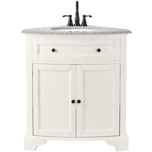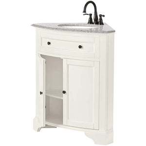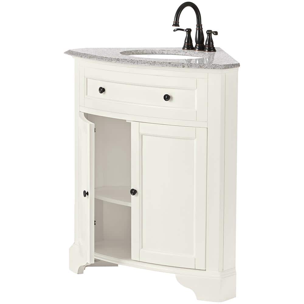 Make the most of your bathroom with the space-saving Hamilton 31 in. Corner Vanity from Home Decorators Collection. The innovative shape helps you gain valuable storage space. Recessed panels, scalloped feet and a white finish add warmth. A natural granite top and oil-rubbed bronze hardware give this furniture-quality piece a timeless touch.. 31 in. W x 23 in. D x 35 in. H. Includes a beautiful grey granite top with centerset, white sink basin. Granite top is pre-drilled for 4 in. faucet spread. Includes oil-rubbed bronze hardware. Sturdy birch/MDF construction. Cottage style. White finish. 2 cabinet doors and false-front drawer look. Some assembly required. Faucet and drain not included. Backsplash not included. Number of Sinks: Single Sink. Vanity Type: Freestanding. Sink Location: Center. Cabinet Material: Wood. Sink Type: Undermount. Sink Shape: Round. Mirror Included: Mirror Not Included. Faucet Hole Spacing (in.): 4 in. Faucet Hole Spacing