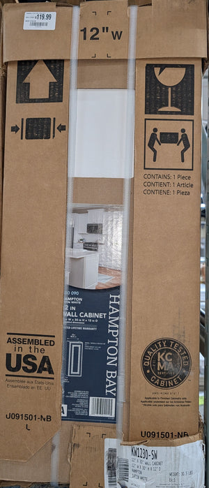 The furniture-quality finish on the Hampton Bay Wall Cabinet adds warmth and beauty to your kitchen design. The cabinet's 3/4 in. shelf thickness offers durability and its adjustable shelf design helps you maximize your storage space. The cabinet is preassembled for hassle-free installation.. Box Material: Furniture Board. Cabinet Construction: Framed. Cabinet Door Height (in.): 29.4. Cabinet Door Width (in.): 11.5. Cabinet Finish: Thermofoil. Cabinet Material: Standard. Cabinet Shade: Light. Cabinet Type: Wall. Color Family: White. Color/Finish: Satin White. Door Handing: Reversible. Door Material: MDF. Finished End: Right and Left. HUD Approved: Yes. Kitchen Cabinet Features: Adjustable Shelves. Number of Drawers: No Drawers. Number of Shelves: 2 Adjustable Shelves. Overlay Type: Full. Style: Cottage. Assembled Depth (in.): 12 in. Assembled Height (in.): 30 in. Assembled Width (in.): 12 in. Interior Cabinet Depth (in.): 11.25 in. Shelf Thickness (in.): 0.75 in. Cabinet Type: Wall. Assembled Width (in.): 12 in. Assembled Height (in.): 30 in. Door Material: MDF. Box Material: Furniture Board. Cabinet Shade: Light. Cabinet Construction: Framed. Cabinet Finish: Thermofoil