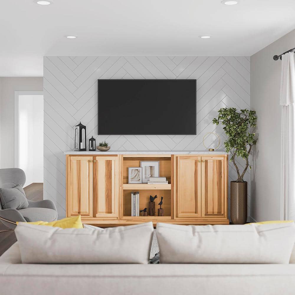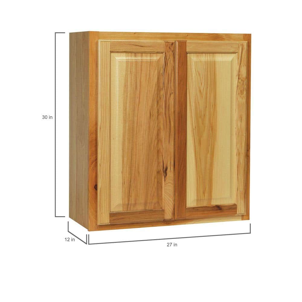 The furniture-quality finish on the Hampton Bay Wall Cabinet adds warmth and beauty to your kitchen design. The cabinet's 3/4 in. shelf thickness offers durability and its adjustable shelf design helps you maximize your storage space. The cabinet is preassembled for hassle-free installation.. Box Material: Furniture Board. Cabinet Construction: Framed. Cabinet Door Height (in.): 27.75. Cabinet Door Width (in.): 12.438. Cabinet Finish: Stained. Cabinet Material: Standard. Cabinet Shade: Light. Cabinet Type: Wall. Color Family: Brown. Color/Finish: Natural Hickory. Door Handing: Bi-Parting. Door Material: Hickory. Finished End: Right and Left. HUD Approved: Yes. Kitchen Cabinet Features: Adjustable Shelves. Number of Drawers: No Drawers. Number of Shelves: 2 Adjustable Shelves. Overlay Type: Partial. Returnable: 90-Day. Style: Rustic,Southwestern. Assembled Depth (in.): 12 in. Assembled Height (in.): 30 in. Assembled Width (in.): 27 in. Interior Cabinet Depth (in.): 11.25 in. Shelf Thickness (in.): 0.75 in. Assembled Width (in.): 27 in. Door Material: Hickory. Cabinet Type: Wall. Assembled Depth (in.): 12 in. Assembled Height (in.): 30 in. Cabinet Shade: Light. Cabinet Finish: Stained. Box Material: Furniture Board.