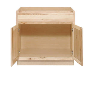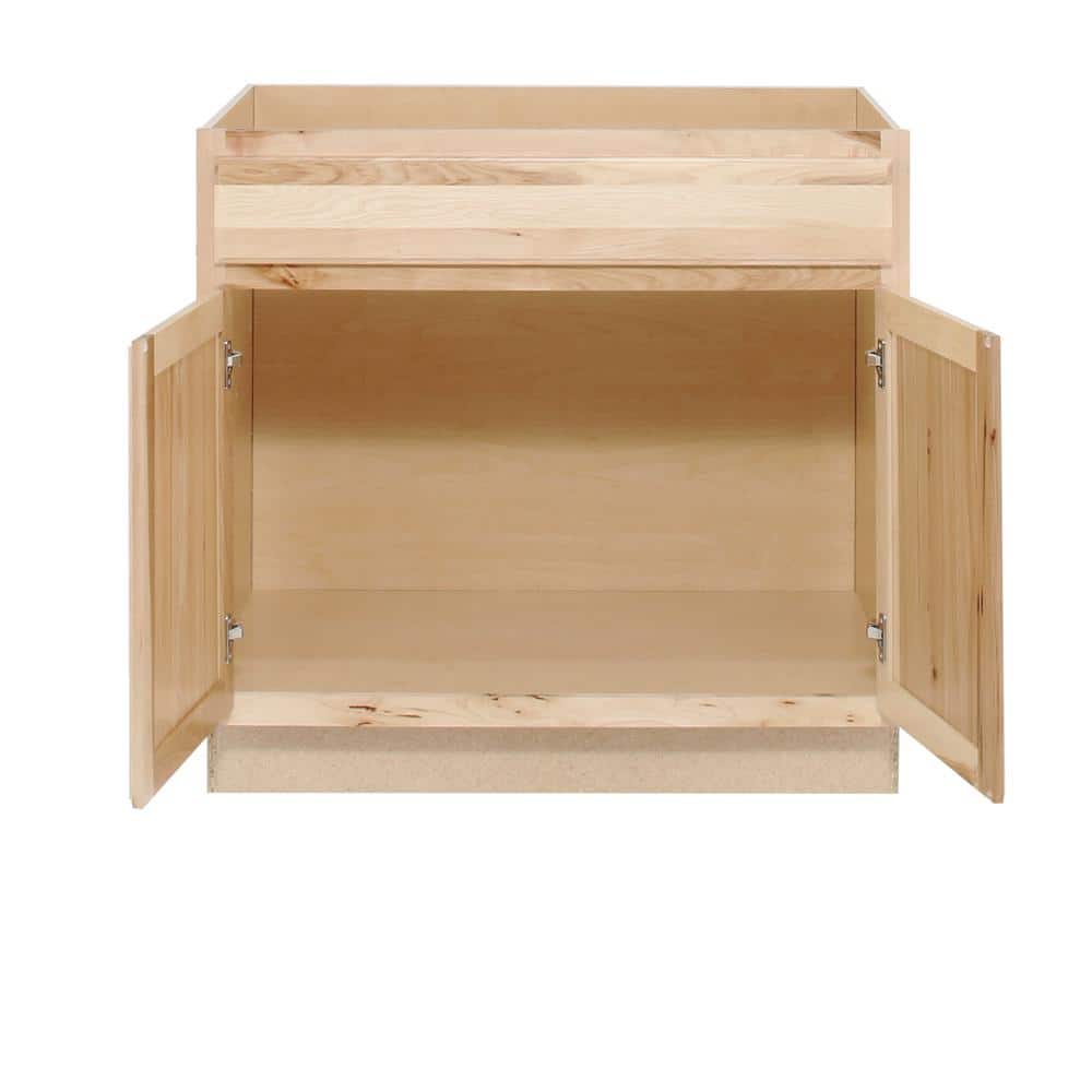 The furniture-quality finish on the Hampton Bay Sink Base Cabinet adds warmth and beauty to your kitchen design. This cabinet features hickory door construction with raised panel door design for a stylish decorative touch. The cabinet is preassembled for hassle-free installation.. Box Material: Furniture Board. Cabinet Construction: Framed. Cabinet Door Height (in.): 21.4. Cabinet Door Width (in.): 13.9567. Cabinet Finish: Stained. Cabinet Material: Other Material. Cabinet Shade: Light. Cabinet Type: Sink Base. Color Family: Brown. Color/Finish: Natural Hickory. Door Handing: Bi-Parting. Door Material: Hickory. Finished End: Right and Left. HUD Approved: Yes. Kitchen Cabinet Features: Finished Interior. Number of Drawers: No Drawers. Number of Shelves: No Shelves. Overlay Type: Partial. Style: Rustic,Southwestern. Assembled Depth (in.): 24 in. Assembled Height (in.): 34.5 in. Assembled Width (in.): 30 in. Interior Cabinet Depth (in.): 23.12 in. Shelf Thickness (in.): 0 in. Assembled Width (in.): 30 in. Cabinet Type: Sink Base. Assembled Height (in.): 34.5 in. Cabinet Finish: Stained. Cabinet Shade: Light. Box Material: Furniture Board. Door Material: Hickory. Cabinet Construction: Framed