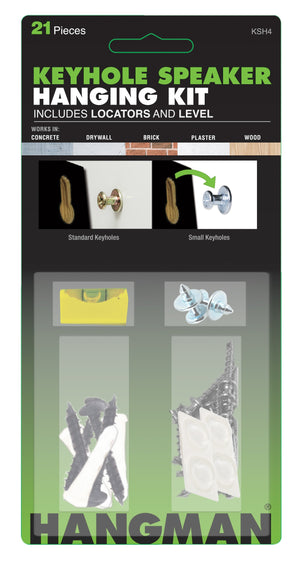 The keyhole speaker hanging kit shows off your speakers not your hardware. Works with single or double keyholes, standard or small. Included locators take the frustration out of keyhole hanging by using markers to pinpoint the exact insertion point. The handy level ensures speakers are level and secure. Double headed bear claw keyhole hangers install with a handheld screwdriver into drywall, wood, and plaster, and into brick or concrete with a 1/8 pilot hole. Will hold 30 LBS in drywall and 100 LBS in stud. Included anchors provide added strength for drywall. Locator's pinpoint the exact insertion point for keyholes Hangers install with a handheld screwdriver into drywall wood and plaster and into brick or concrete with a 1/8 pilot hole Double-headed keyhole hangers work with standard or mini keyholes Level included Will hold 30 LBS in drywall and 100 LBS in stud Drywall anchors included for added strength Patented Collection Name: Key Hole Color/Finish Family: Silver Manufacturer Color/Finish: Gold/Zinc Type: Keyhole speaker hanging kit Depth (Inches): 1.1875 Length (Inches): 0.1875 Maximum Weight Capacity (lbs.): 30 Width (Inches): 0.29 Adjustable: No Hardware Included: Yes Locking: No Material: Zinc Plated Steel Motion: Fixed Mount Type: Wall Telescoping: No Use Location: Indoor Weather Resistant: No CA Residents: Prop 65 Warning(s): No Safety Listing: Not safety listed UNSPSC: 23153400