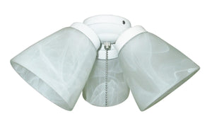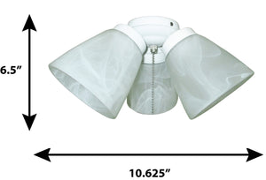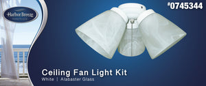 Pair this classically styled 3 light kit with your outdoor ceiling fan. This item is wet rated for your peace of mind. This light kit is wet rated, perfect for porches, patios, or any outdoor location. Includes three 6.5 watt medium base bulbs. Features 3 beautiful alabaster glass shades. Universal light kit can be used on almost any Harbor Breeze fans. Color/Finish Family: White. Fixture Color: White. Manufacturer Color/Finish: White. Shade Color: Alabaster. Type: Light kit. Height (Inches): 6.5. Length (Inches): 11. Weight (lbs.): 1. Width (Inches): 10.63. Bulb Type: LED. Bulb(s) Included: Yes. Commercial/Residential: Commercial/Residential. Light Bulb Base Type: Medium base (E-26). Material: Metal. Maximum Bulb Wattage: 6.5. Number of Bulbs Required: 3. Package Quantity: 1. Shade/Glass Type: Alabaster. Usage Rating: Wet rated. Use Location: Outdoor. Wattage Equivalent: 120. CA Residents: Prop 65 Warning(s): Yes. ENERGY STAR Certified: No. Safety Listing: UL safety listing. UNSPSC: 40101600.