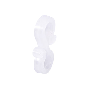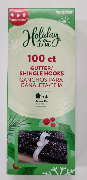 Gutter or shingle universal S hook 100 count for use with all light types. Easily attaches to shingles or gutters. For use with tube, globe, miniature, icicle, swag, C7, C9 and LED light strands. Installation and removal is quick and easy. Color/Finish Family: Clear. Type: Gutter/Shingle clips. Decorative: No. Occasion: Christmas. Package Quantity: 1. Primary Material: Plastic. CA Residents: Prop 65 Warning(s): No. UNSPSC: 39111900.