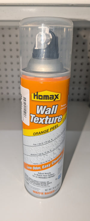 The Homax products 20 oz. aerosol spray texture is a great choice for patching and texturing small rooms and accent walls in occupied areas like schools, offices and health facilities. Designed to patch orange peel and splatter textures, this versatile texture matches fine, medium and coarse textures. The low-odor, water-based formula cleans up easily with soap and water.. Low-odor, water-based formula cleans up easily. Adjustable nozzle matches your desired spray pattern. Use to patch small rooms and walls in occupied areas. Water-based, low-odor formula. Patches orange peel and splatter textures. Ideal for use in occupied areas, including schools, offices and health facilities. 20 oz. can provide coverage for up to 110 sq. ft.. Flat sheen. No more bald spots. Actual paint colors may vary from on-screen and printer representations. Actual paint colors may vary from on-screen and printer representations. . Aerosol / NonAerosol: Aerosol. Application: Wall & Ceiling Spray Texture. Base Material: Water Based. Coating Product Category: Prep/Finishing & Care. Color Family: White. Color/Finish: White. Dry to Touch (min.): 30 min. Interior/Exterior: Interior. Kit: Individual. Number per Package: 1. Paint Type: Interior Paint. Paint/Stain Clean Up: Soap & Water. Paint/Stain Features: Pattern spray adjustment,Primer Required,Textured. Sheen: Flat/Matte. Surface Material Use: Drywall. Transparency: Solid. Container Size: 20 Ounce. Coverage Area (sq. ft.): 110 sq ft