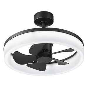 Transform your indoor and covered outdoor spaces with the Hampton Bay Dialstone 23 in. Matte Black Indoor/Outdoor Fandelier. This stunning fixture offers versatile lighting options with its integrated LED light kit, giving you the freedom to choose from 3,000K, 4,000K or 5,000K light output. Plus, the included remote allows you to control the dimming, CCT and speed functions with ease. Modern indoor/outdoor fandelier design with matte black finish. Integrated LED light technology allows color temperature changing. Remote control operates fan speed and color temperature of light. Trendy fandelier style design. Uses four 7-W LED light strips, included. 3,000K, 4,000K or 5,000K light output options. Designed for indoor/covered outdoor use, damp rated. Handheld remote controls speed, dimming and color temperature of the light. Cools small area. 4.5 in. down rod with 3/4 in. Dia. Limited assembly required. 8.48 in. overall fan height with 4.5 in. downrod. Actual Color Temperature (K): 3000,4000,5000. Blade Color: Matte Black. Blade Color Family: Black. Blade Material: Acrylonitrile Butadiene Styrene (ABS). Blade Pitch: 16. Ceiling Fan Design: Caged,Fandelier. Ceiling Fan Size: Small. Color Temperature: Adjustable White. Commercial/Residential: Commercial,Residential. Control Type: Remote. Damp/Wet Rating: Damp Rated (Covered Outdoor). Dimmable Capability: Dimmable. Durability: Weather Resistant. Features: Dimmable,Reversible Rotation. Housing Color: Matte Black. Housing Color Family: Black. Housing Material: Steel. Included: Downrod Included. Indoor/Outdoor: Indoor,Outdoor. Light Bulb Type Included: Integrated LED. Location Use: Barn,Bathroom,Bedroom,Dining Room,Foyer,Garage,Kids Room,Kitchen,Living Room,Nursery,Office,Patio. Lumens: 1600. Max. Airflow (CFM): 1541. Max. Motor Speed (RPM): 526 RPM. Motor Type: AC. Mounting Type: Angled Mount,Downrod Mount. Number of Blades: 5. Number of Lights: 1. Number of Speeds: 3. Recommended Room Size: Small Room (250 sq. ft.). Shade Material: Plastic. Shade Shape: Round. Watt Equivalence: 100. Certifications and Listings: FCC Listed,UL Listed. Assembled Depth (in.): 23.00 in. Assembled Height (in.): 13.60 in. Assembled Weight (lbs.): 13.84 lb. Assembled Width (in.): 23.00 in. Blade Length (in.): 18 in. Blade Width (in.): 18 in. Downrod Length (in.): 4.5. Fan Blade Span (in.): 18 in.