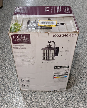 The versatile and exclusive Summit Ridge Outdoor Lantern from Home Decorators Collection features a strong, sleek frame and windowpane detailings. It's inspired by the classic Arts and Crafts movement and graced with rippling water glass panels that create a warm, welcoming glow. This outdoor wall mount lantern comes equipped with energy efficient LEDs that provide 50,000 hours of lamp life and 434 Lumens of output. The light hue emitted is 3000K of bright white light and the lantern features an amazing dusk-to-dawn setting that allows it to turn on and off at dawn.. 13.13 in. Outdoor Wall Lantern that complements exterior d cor. Zinc Finish with Water Glass and Dusk to Dawn feature. Integrated LED produces 434 Lumens and 60-watt equivalence. 434 Lumen (53.58 Lumen per-Watt). Light color is 3000K (bright white). Color accuracy index (CRI) is 80. This lantern is not dimmable. Uses 8.1-Watt. Features a rustic iron finish with clear water glass. Find matching lanterns available exclusively at The Home Depot. Click here to learn more about exclusive Home Decorators Collection products . Click here to learn more about Eco Options and Energy Efficiency . Click here for more information on Electronic Recycling Programs . Actual Color Temperature (K): 3000. Color Rendering Index (CRI): 80. Color Temperature: Warm White. Damp/Wet Rating: Damp Rated. Durability: Weather Resistant. Exterior Lighting Product Type: Sconce. Fixture Color/Finish: Zinc. Fixture Material: Stainless Steel. Glass Type: Clear Glass. Included: Hardware Included. Indoor/Outdoor: Outdoor. Light Bulb Type Included: Integrated LED. Light Direction: Down. Lumens: 434. Number of Lights: 1 Light. Outdoor Lighting Features: Dusk to Dawn. Package Quantity: 1. Power Source: Hardwired. Product Size: Medium. Product Weight (lb.): 4.95 lb. Sconce Type: Lantern. Shade Material: Glass. Shape: Rectangle. Style: Global. Voltage Type: Line Voltage. Watt Equivalence: 60. Mounting Plate Height (in.): 4.567. Mounting Plate Width (in.): 6.299. Product Depth (in.): 9.38 in. Product Height (in.): 13.13 in. Product Width (in.): 6.88 in