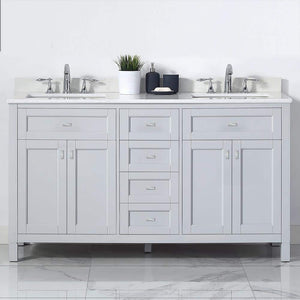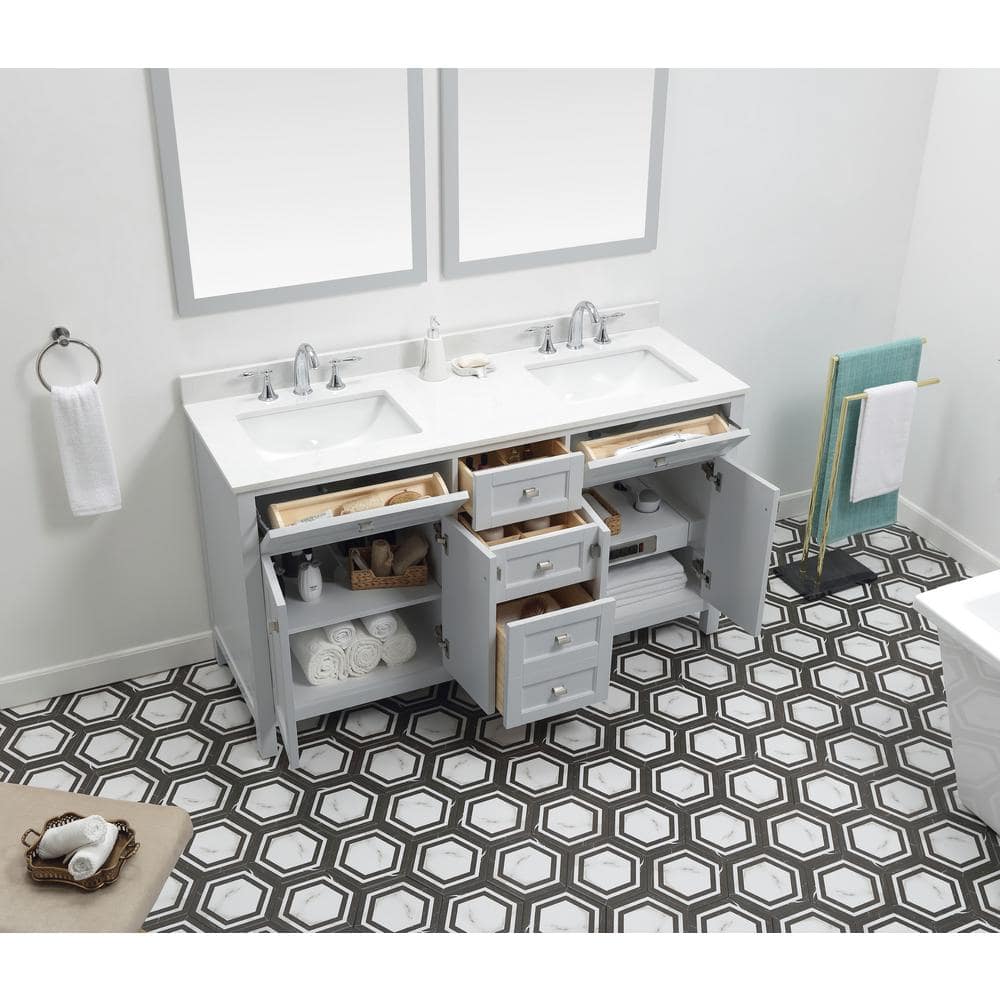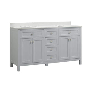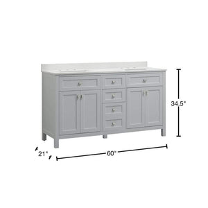 The perfect solution for any bathroom remodel or new construction, the classic panel molding and clean lines of our Juniper 60 in. dove gray double vanity make it a timeless centerpiece for your master bath. Installed as a freestanding cabinet, the solid construction and thoughtful features provide smart storage solutions for the most-used room in the house. Vanity comes pre-assembled, complete with a pre-drilled vanity top ready for the installation of your favorite faucet.. Assembled: Assembled. Backsplash Included: Backsplash Included. Cabinet & Top Assembled weight (lbs): 260.1. Cabinet Color: Dove Gray. Cabinet Color Family: Gray. Cabinet Material: Wood. Cabinet Shade: Light. Faucet Hole Spacing (in.): 8 in. Faucet Hole Spacing. Faucet Included: Faucet Not Included. Hardware Finish Family: Nickel. Included: Mounting Hardware,Pull Handle(s). Mirror Included: Mirror Not Included. Number of Drawers: 3. Number of Shelves Included in Cabinet: 2. Number of Sinks: Double Sink. Returnable: 90-Day. Sink Color: White. Sink Color Family: White. Sink Location: Center. Sink Material: Ceramic. Sink Shape: Rectangular. Sink Type: Undermount. Style: Transitional. Top Color: Yves White. Top Color Family: White. Top Material: Engineered Stone. Top weight (lb.): 105.84. Vanity Features: Predrilled,Sink Overflow Drain,Soft Close Doors,Soft Close Drawers,With Electrical Outlet. Vanity Top Edge Type: Straight. Vanity Type: Freestanding. Backsplash Height (in.): 3. Basin Depth (in.): 7.50. Basin Length (in.): 15. Basin Width (in.): 20.25. Cabinet Depth (in.): 21.00. Cabinet Height (in.): 33.70. Cabinet Width (in.): 59.00. Product Depth (in.): 21 in. Product Height (in.): 34.5 in. Product Width (in.): 60 in. Vanity Top Thickness (in.): .75. Number of Sinks: Double Sink. Vanity Type: Freestanding. Cabinet Material: Wood. Faucet Hole Spacing (in.): 8 in. Faucet Hole Spacing. Sink Location: Center. Top Material: Engineered Stone. Mirror Included: Mirror Not Included. Sink Type: Undermount