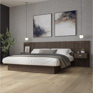 Elevate your bedroom with the ZEN ALPHA 4-piece set a perfect blend of modern serenity and practical design. This set includes a platform bed, a refined headboard, and two wall-mounted nightstands, making it a complete and cohesive centerpiece for your sleeping space. The ZEN ALPHA set comes in multiple color options, each paired with a distinctive finish: *The Karisma finish, offered in beige and brown, features a synchronized texture that faithfully mimics the grain and feel of natural wood adding warmth and authenticity to your d cor. *The Prelude finish, used for the gray option, presents a smooth, contemporary surface that s ideal for a sleek, timeless look. The set s clean, modern lines are enhanced by the two wall-mounted nightstands, each equipped with a 12-inch drawer and a sleek silver metal handle. These floating nightstands offer practical storage while preserving the airy, minimalist aesthetic of the room. Transform your bedroom into a peaceful, modern retreat with the ZEN ALPHA collection where elegance meets function, and every detail invites calm. Pieces Included: Bed; Nightstand Frame Material: Manufactured Wood Bed Included: Yes Nightstand Included: Yes Nightstand Drawers Included: Yes Drawer Glide Type & Extension: Metal Slide Mirror Included: No Slats Required: No Imported: Yes Bed Weight Capacity: 500 Box Spring Required: No Center Support Legs: Yes Number of Products in Set: 4 ISTA Certified: 1A