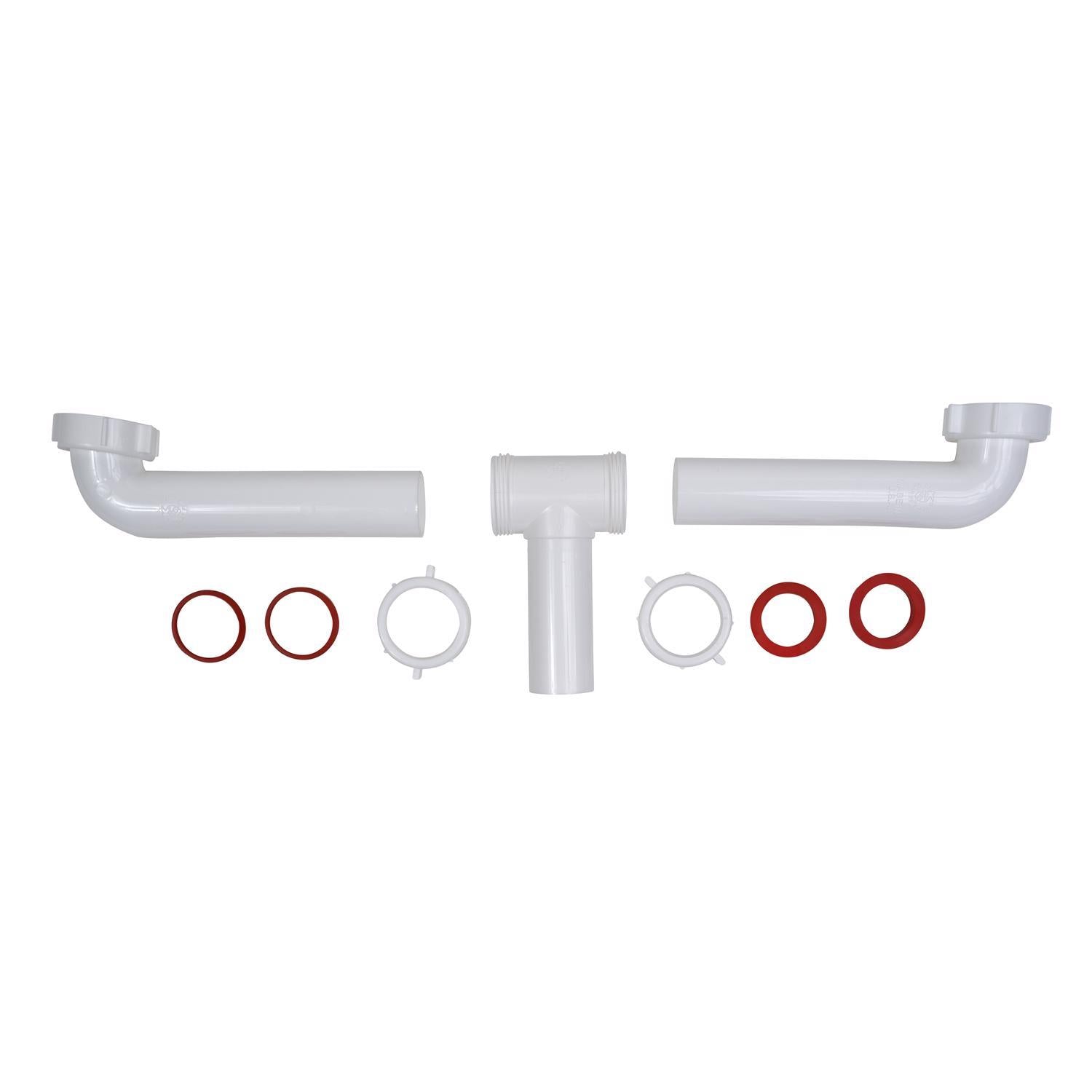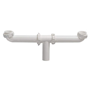 This double bowl sink pipe is constructed of durable, white polypropylene and has a center outlet continuous waste baffled tee. It is flanged for a direct connection to a sink strainer, with 1.5-in. inlets and 16-inch. Includes all necessary nuts and washers.