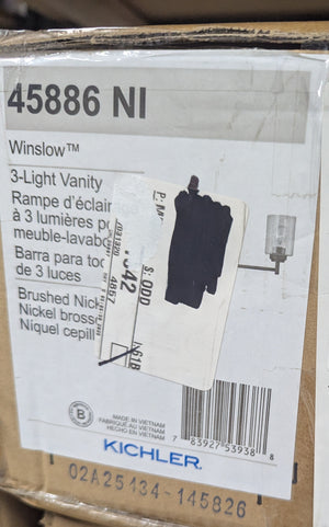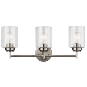 The KICHLER Winslow 21.5 in. 3-Light Brushed Nickel Vanity Light illustrates the setup of your bath vanity. 3 clear seeded cylindrical glass shades cast a scattered glow to evenly light up your bath. A shiny brushed nickel finish completes the look and gives your wall a radiant touch.. Ideal for use as vanity lighting in the bathroom. Contemporary brushed nickel bathroom vanity light fixture. Requires three 75-Watt max medium base bulbs (not included). Durable steel frame improves the fixture's stability. Brushed nickel finish adds a radiant touch to your space. Clear seeded glass shades allow for even diffusion of light. Uses 3 incandescent 75-Watt A19 bulbs (sold separately). ETL listed for use in damp locations. Elegant fixture with chic styling complements most decor styles. Exclusively intended for interior lighting. Can be mounted with shades pointed upward or downward. Compatible Bulb Type: Eco-Incandescent. Damp/Wet Rating: Damp Rated. Features: Multi Mounting Positions. Fixture Color Family: Nickel. Fixture Color/Finish: Brushed Nickel. Fixture Material: Metal. Included: Mounting Hardware. Light Bulb Base Code: E26. Light Bulb Type Included: No Bulbs Included. Max. Bulb Wattage (W): 75 W. Mounting Position: Non-Directional. Number of Lights: 3. Power Source: Hardwired. Product Weight (lb.): 4.1 lb. Recommended Light Bulb Shape Code: A19. Recommended Vanity Size (in.): 24. Shade Color Family: Clear. Shade Material: Glass. Shade Shape: Cylinder. Style: Industrial. Certifications and Listings: ETL Listed. Fixture Height (in.): 9.25 in. Fixture Width (in.): 21.5 in. Mounting Plate Height (in.): 4.75 in. Mounting Plate Width (in.): 4.75 in. Product Depth (in.): 6.5 in