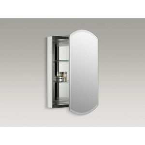 With its sleek anodized aluminum and glass construction, the Archer mirrored cabinet provides a stylish complement to your bath or powder room. Mirrors are positioned on the front and back of the door as well as the interior back wall of the cabinet. Two adjustable glass shelves hold your toiletries and bath items. Durable aluminum construction makes this cabinet rust- and rot-resistant.. Reversible hinges for left-hand or right-hand swing. Side mirrors included for surface mount installation. 2 adjustable shelves included. Anodized aluminum construction with a durable rust-free and chip-free finish. 2 adjustable tempered glass shelves. Full-overlay mirrored door with beveled edges. Mirrors on back of door and interior back of cabinet. 2-way adjustable hinges with 108 opening capability for easy cabinet access. Can be installed with left- or right-hand swing. Includes mounting hardware for surface or recessed installation. Includes side mirror kit for surface mount installation. Coordinates with other products in the Archer collection. . Click to shop for more Kohler products. Assembly Required: Assembled. Color Family: Silver. Color/Finish: Aluminum. Door Swing: Right. Door Type: Reversible. Features: Adjustable Hinges,Concealed Hinges. Included: No Additional Included Components. Material: Aluminum. Medicine Cabinets Size: Medium. Mount Style: Recessed/Surface Mount. Number of Shelves: 2 Shelves. Product Weight (lb.): 29 lb. Recessed Opening Depth (in.): 19.0. Shape: Arched. Weight Capacity (lb.): 38 lb. Product Depth (in.): 4.81 in. Product Height (in.): 31 in. Product Width (in.): 20 in. Recessed Opening Height (in.): 25.25. Recessed Opening Width (in.): 19.25. Shelf width (in.): 19