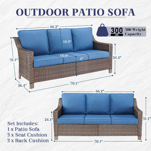 Elevate your outdoor living with the Gymojoy Outdoor Wicker Conversation set, featuring a spacious 3-seat sofa, two versatile ottomans, two classic club chairs, and two multi-functional swivel Glider chairs. Crafted with a rust-proof steel frame and all-weather PE wicker, this set is designed for durability and comfort, making it ideal for patios, gardens, and poolside relaxation. The thick, high-density foam cushions provide exceptional support, while the wide armrests and deep seats invite you to unwind. Waterproof and UV-resistant olefin cushion covers ensure easy maintenance and long-lasting freshness. Whether hosting gatherings or enjoying quiet moments, this elegant furniture set transforms any outdoor space into a stylish retreat, perfect for family and friends. Number of Ottomans Included: 2 Number of Sofas Included: 1 Product Type: Sofa Seating Group Pieces Included: Sofa; Chair; Ottoman / Footrest; Cushion(s) Total Number of Pieces Included: 7 Sofa Included: Yes Chair Included: Yes Number of Chairs Included: 4 Ottoman Included: Yes Cushions Included : Yes Number of Cushions Included: 16 Chair Features: Swivel; Ergonomic Seating Capacity: 9 Seat Frame Material: Polyethylene (PE) Wicker Cushion Cover Material: Polypropylene / Olefin Chair Weight Capacity: 350 Product Care: Do not use strong liquid cleaners Cushion Color: Blue Frame Color / Finish: Brown Table Color: Brown Chair Type: Lounge Chair/Club Chair; Rocker/Glider Durability: Fade Resistant; Mold / Mildew Resistant; Rust Resistant; UV Resistant; Water Resistant; Weather Resistant