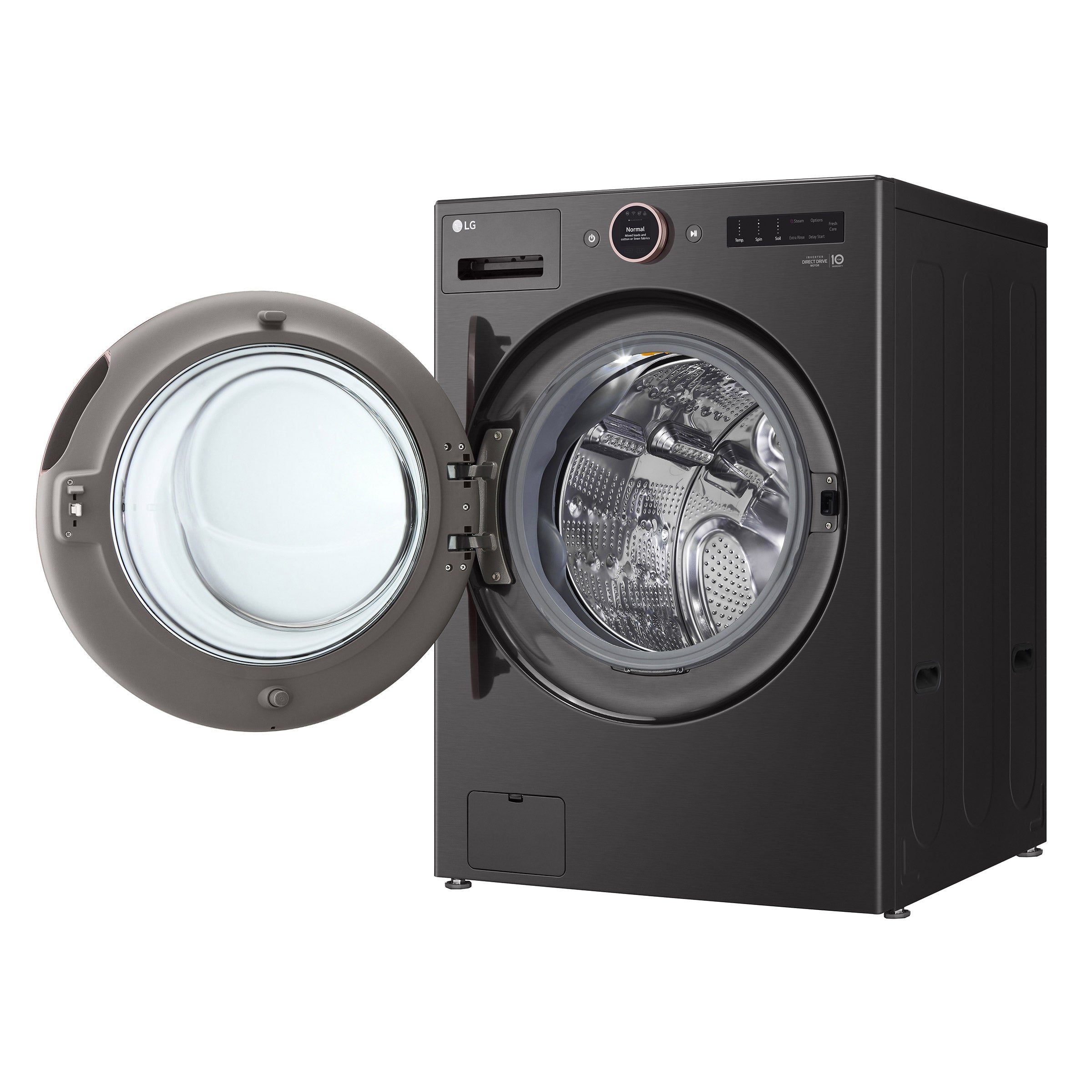 LG 5.0 cu. ft. Mega Capacity Smart Front Load Washer with Turbowash 360 and AI DD Built-In Intelligence Digital Dial Control with LCD Display TurboWash 360 Technology Cold Wash Technology ThinQ Technology with ThinQ Care ENERGY STAR Most Efficient