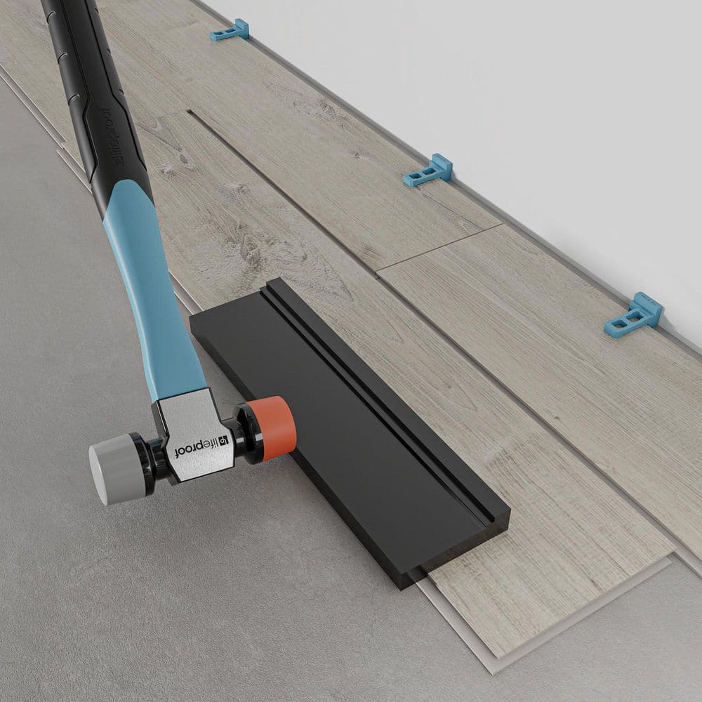 Make hardwood, laminate and vinyl flooring installation easy with the Lifeproof Professional Flooring Installation Kit. This kit includes a new and improved tapping block that resists chipping and warping, and prevents damage when joining planks, a wide angle pull bar that joins plank ends in tight or hard to reach places, a poly fiber mallet with 2 sides to use according to the flooring application, and (30) 4-in-1 expansion spacers that hold firm and won't tip over during installation. The tools in this flooring installation kit take out the guesswork and shopping here and there for the right pieces. It has the essential tools you need to install hardwood flooring, laminate, click-lock vinyl plank, and glued vinyl like a Pro. All the pieces in this flooring install kit are easy to clean and can be reused.. Essential tools to install hardwood, laminate, vinyl flooring. 33-piece kit with mallet, new tapping block, pull bar and spacers. Lifeproof kit for both professional and do-it-yourself installers. Flooring installation kit for glued vinyl, click lock vinyl plank, laminate, and hardwood flooring. Designed to take out the guesswork, it includes a 16 oz. mallet, a new and improved tapping block, a wide angle pull bar, and thirty 4-in-1 flooring expansion spacers. 16 oz. double face mallet can be used for glued or click lock vinyl using the firm red end, and for laminate or hardwood flooring using the soft grey end. Dual-sided, new and improved tapping block resists chipping and warping, and prevents damage when joining planks. Wide angle pull bar joins plank ends in tight or hard to reach places. 4-in-1 flooring expansion spacers hold firm and won't tip over during installation. Includes 33-pieces that are easy to clean and can be reused. Color Family: Black. Flooring Product Type: Accessory. Flooring Type: Engineered Hardwood,Laminate,Vinyl. Material: Plastic. Pack Size: 33. Product Weight (lb.): 3.3 lb. Diameter (in.): 1 in. Product Width (in.): 5.25 in