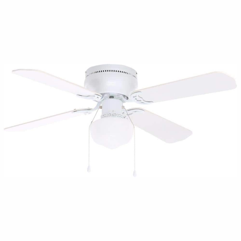 The Littleton 42 in. ceiling fan features a white finish with 4 reversible white/bleached oak blades. The schoolhouse light kit has a frosted glass globe shade for a traditional look that complements a variety of decor styles. This fan is ideal for rooms up to 10 ft. x 10 ft. in size and offers a 3-speed reversible motor to keep you comfortable in any season. It will provide up to 2968 CFM airflow, comes with a pull chain for ease of operation and a 7.5-Watt LED bulb for your convenience. Standard flush-mount installation. White finish for housing and light fixture. Schoolhouse light kit with frosted glass. Light kit included. 9-Watt LED bulb included. Up to 2968 CFM airflow. Indoor use, for small room sizes up to 10 ft. x 10 ft. Light kit not optional. Pull chain offers simple operation. 4 reversible white/bleached oak blades make it easy to change your decor without replacing the entire unit.