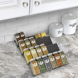 LARGE CAPACITY 4 TIER SPICE RACK TRAY to organize all of your spices, seasoning, condiments, herbs, essential oils, vitamins, medicine, and more throughout your home. Organizes up to 24 standard size spice jars (jars not included) HEAVY GAUGE STEEL USING A DURABLE SILVER METALLIC EPOXY FINISH for unparalleled strength and durability. Our tray will not crack, warp, stain, break, yellow, or splinter like plastic, acrylic, or wood organizers. It s also easy to wipe clean TRAY FITS 10-1/2 WIDE (OR GREATER) DRAWERS in kitchens, bathrooms, and offices AVAILABLE IN 3 SIZES: 10-1/4 WIDE, 13-1/4 WIDE, AND EXPANDABLE 14-26 WIDE to fit all your needs Dimensions: 10-1/4 W x 16-1/2 L x 1-1/2 H