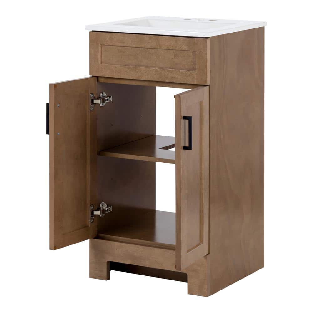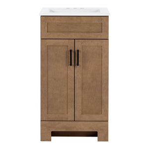 Designed to maximize space in small spaces, the 18.5 in. W x 16.75 in. D x 34.64 in. H Lyton bathroom vanity in sand features a narrow design and an adjustable interior shelf. Its full-overlay slim Shaker-style profile features a warm medium-toned woodgrain finish that's accented by matte black door handles. And its soft-close single-door cabinet includes an adjustable interior shelf for flexible storage space and easy access to your plumbing. This vanity set is completed with a 1-piece white cultured marble sink top that's predrilled for a 4 in. centerset faucet and includes an integrated rectangular sink. Designed for quick installation around your existing plumbing, this freestanding bathroom vanity features an open-back design, adjustable door hinges and an unattached sink top.. Assembled: Assembled. Assembly Required: No. Backsplash Included: Backsplash Not Included. Cabinet & Top Assembled weight (lbs): 48.06. Cabinet Color: Sand. Cabinet Color Family: Brown. Cabinet Material: Particle Board. Cabinet Shade: Medium. Faucet Hole Spacing (in.): 4 in. Faucet Hole Spacing. Faucet Included: Faucet Not Included. Hardware Finish Family: Black. Included: No Additional Included Components. Mirror Included: Mirror Not Included. Number of Drawers: 0. Number of Shelves Included in Cabinet: 1. Number of Sinks: Single Sink. Sink Color: White. Sink Color Family: White. Sink Location: Center. Sink Material: Cultured Marble. Sink Shape: Rectangular. Sink Type: Integral. Top Color: White. Top Color Family: White. Top Material: Cultured Marble. Top weight (lb.): 14.33. Vanity Features: Adjustable Hinges,Concealed Hinges,Soft Close Doors,Toe Kick. Vanity Top Edge Type: Flat. Vanity Type: Freestanding. Basin Depth (in.): 3.75. Basin Length (in.): 14.26. Basin Width (in.): 9.71. Cabinet Depth (in.): 16.42. Cabinet Height (in.): 34.02. Cabinet Width (in.): 17.95. Product Depth (in.): 16.75 in. Product Height (in.): 34.64 in. Product Width (in.): 18.5 in. Vanity Top Thickness (in.): 0.63. Number of Sinks: Single Sink. Vanity Type: Freestanding. Cabinet Material: Particle Board. Faucet Hole Spacing (in.): 4 in. Faucet Hole Spacing. Sink Location: Center. Top Material: Cultured Marble. Mirror Included: Mirror Not Included. Sink Type: Integral